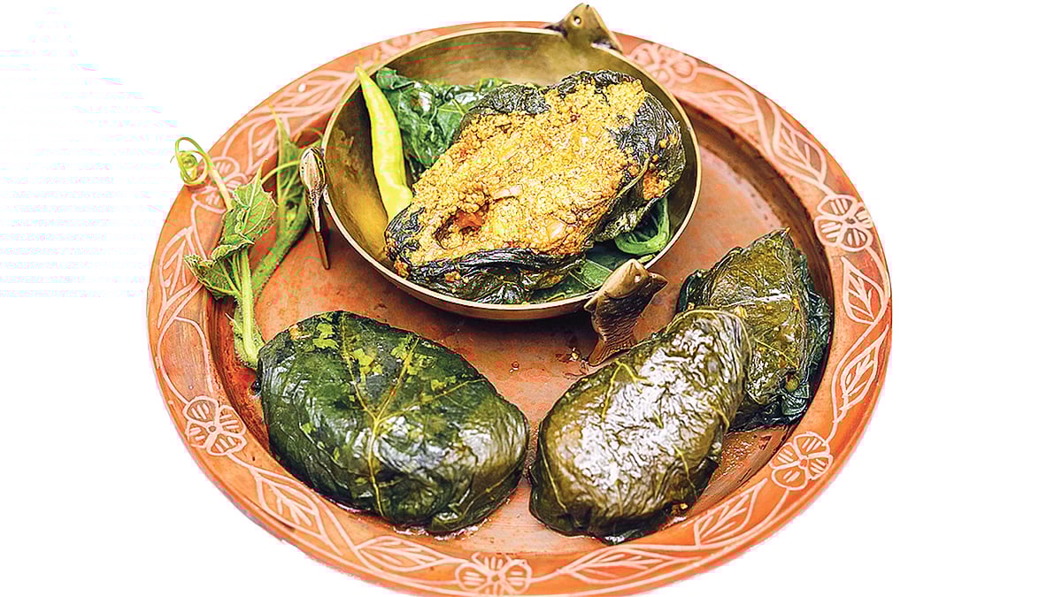 উপকরণ: ইলিশ ৬ টুকরা, কুমড়াপাতা ৬টি, শর্ষেবাটা ২ টেবিল চামচ, কাঁচা মরিচবাটা আধা চা–চামচ, লবণ পরিমাণমতো, মরিচগুঁড়া আধা চা–চামচ, হলুদগুঁড়া আধা চা–চামচ ও শর্ষের তেল ২ টেবিল চামচ।