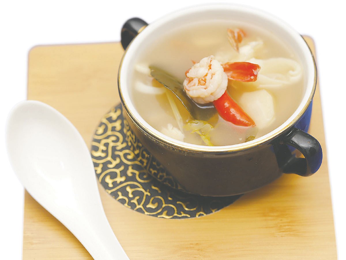আদা ও গ্যালাংগা বা থাই আদা একত্রে ছেঁচে নিতে হবে। এখন একটি পাত্রে পেঁয়াজকুচি, মাশরুম, গাজর নিয়ে এতে পেরি পেরি মরিচ, লেবুপাতা, লেমন গ্রাস, ছেঁচে নেওয়া আদা ও গ্যালাংগা দিয়ে পানি দিতে হবে। ঢেকে মাঝারি আঁচে রান্না করতে হবে। গরম তেলে সি ফিশ একটু লবণ ও গোলমরিচের গুঁড়া দিয়ে মেখে ভেজে নিয়ে তেলসহ মাছগুলো স্যুপে দিতে হবে। গোলমরিচের গুঁড়া, সয়া সস, বেসিল, ধনেপাতা ও লবণ দিয়ে দিন। এরপর নেড়েচেড়ে কিছুক্ষণ পর নামিয়ে পরিবেশন করুন।