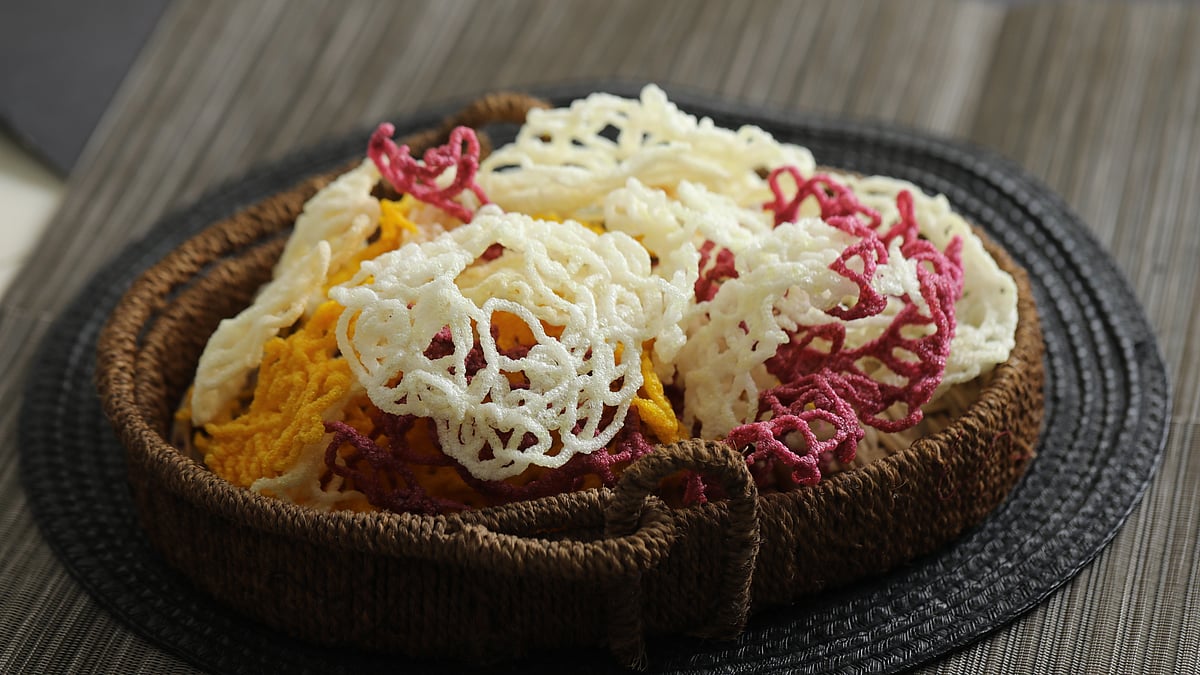 প্রণালি: সামান্য পানি দিয়ে ভাত ব্লেন্ড করে নিন। এর সঙ্গে লবণ ও খাবার রং মিশিয়ে নিন। কলাপাতার ওপর তেল ব্রাশ করে নেবেন। সিরিঞ্জে ভাতের পেস্ট নিয়ে কলাপাতার ওপর পছন্দমতো নকশা তৈরি করুন। ভাপে দিয়ে সেদ্ধ করে নিন। ডালা বা সমান বড় প্লেটে তেল ব্রাশ করে নিন। কলাপাতা থেকে পাঁপড় বের করে ডালায় ছড়িয়ে রোদে শুকিয়ে নিন। সংরক্ষণ করে রাখুন। খাবার আগে গরম তেলে ভেজে নেবেন। এই পাঁপড়ের ওপর চাইলে চিনি ছড়িয়ে খেতে পারেন।
