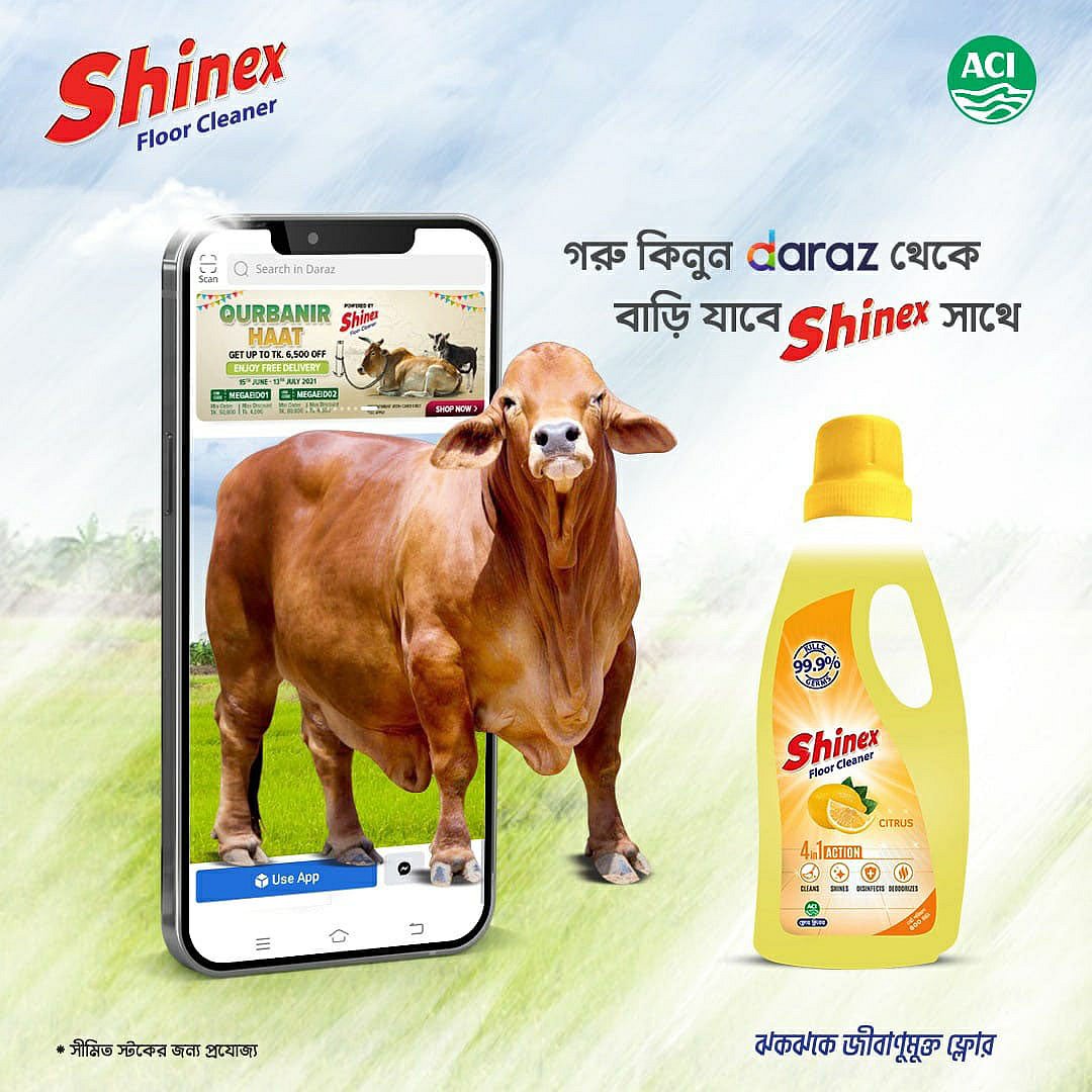 করোনার এই সময়ে মানুষকে সুস্থ ও নিরাপদ রাখার উদ্দেশ্যে দারাজ অনলাইন কোরবানির হাট ক্যাম্পেইনে যুক্ত হলো এসিআই-এর শাইনেক্স ফ্লোর ক্লিনার। কোনো ক্রেতা দারাজ অনলাইন হাট থেকে এই কুরবানির ঈদে গরু কিনলেই সাথে পাচ্ছেন ফ্রি শাইনেক্স অ্যান্টিব্যাকটেরিয়াল ফ্লোর ক্লিনার যা মেঝেকে রাখে ঝকঝকে ও ধ্বংস করে ৯৯.৯% জীবাণু। এর মনমাতানো সৌরভ দূর করে মেঝেতে থাকা দুর্গন্ধ। শাইনেক্স ফ্লোর ক্লিনারের এই অফারটি পেতে ক্লিক করুন এখানে: https://click.daraz.com.bd/e/_6X6Mv