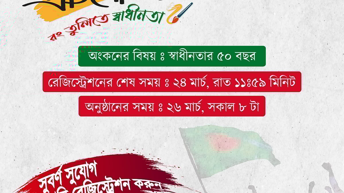 এ বছর বাংলাদেশের স্বাধীনতার ৫০ বছর পূর্তি হয়েছে। এ উপলক্ষে আগামী ২৬ মার্চ শুক্রবার কেএফসি ও পিৎজা হাটের যৌথ উদ্যোগে আয়োজিত হচ্ছে ‘রং-তুলিতে স্বাধীনতা’ শীর্ষক ‘চিত্রাঙ্কন প্রতিযোগিতা-২০২১’। ৫ থেকে ৮ বছরের শিশুরা অংশগ্রহণ করতে পারবে এ প্রতিযোগিতায়। বাংলাদেশের স্বাধীনতার ইতিহাস ও মূল্যবোধ জাগ্রত করতে চিত্রাঙ্কনের বিষয় ধার্য করা হয়েছে ‘স্বাধীনতার ৫০ বছর’। প্রতিযোগিতায় অংশগ্রহণ করতে এ লিংকে রেজিস্ট্রেশন করতে হবে।
