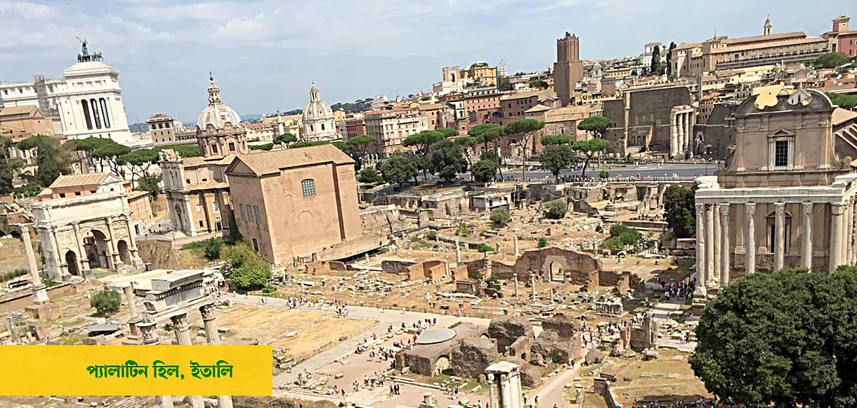 সিটিতে গিয়ে হোটেলের রুম পেতে প্রায় দুপুর! সব অ্যাট্রাকশন কাছেই। ফ্রেশ হয়েই হাঁটতে বেরোলাম সবার পিছে পিছে! হোটেল সেভাবেই নেওয়া, স্টেশনের কাছে, হাঁটার রাস্তা। হাঁটতে হাঁটতেই ইতালির পাথুরে রাস্তায় কতশত স্যুভেনিরের দোকান পেরোতেই দেখি, আসল স্যুভেনির—বিশাল ধ্বংসস্তূপ! ঠিক ধ্বংসস্তূপ নয়, হিস্ট্রি! মার্বেলের টাওয়ার রাস্তার পাশে পাশে, সবার পিছু পিছুই পৌঁছে গেলাম সেই পুরোনো প্রাসাদে, হাজারো ধ্বংসস্তূপে! সামনেই পাঁচ-সাততলা ইটের টাওয়ার কত হাজার বছরের স্মৃতি নিয়ে দাঁড়িয়ে আছে! দু-একজনকে দেখলাম তার মাথায়, গন্তব্য সেটাই। রোমান ফোরাম। একেকটা টাওয়ারের ধ্বংসস্তূপ, প্রাচীন জেল, বাগান—কী নেই? হাঁটতে হাঁটতে ওপরে যেতেই দেখি এক পাশে কলোসিয়াম। কাল যাব ভাবছি। ঘুরত ঘুরতে কয়েক ঘণ্টা কীভাবে চল গেল, বুঝিনি।