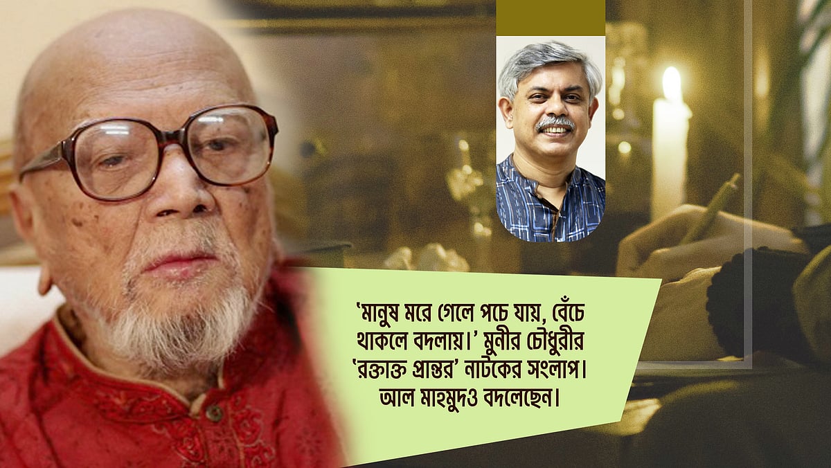 এর সঙ্গে যুক্ত করতে হয়, ‘মানুষ মরে গেলে পচে যায়, বেঁচে থাকলে বদলায়।’ মুনীর চৌধুরীর ‘রক্তাক্ত প্রান্তর’ নাটকের সংলাপ। আল মাহমুদও বদলেছেন।