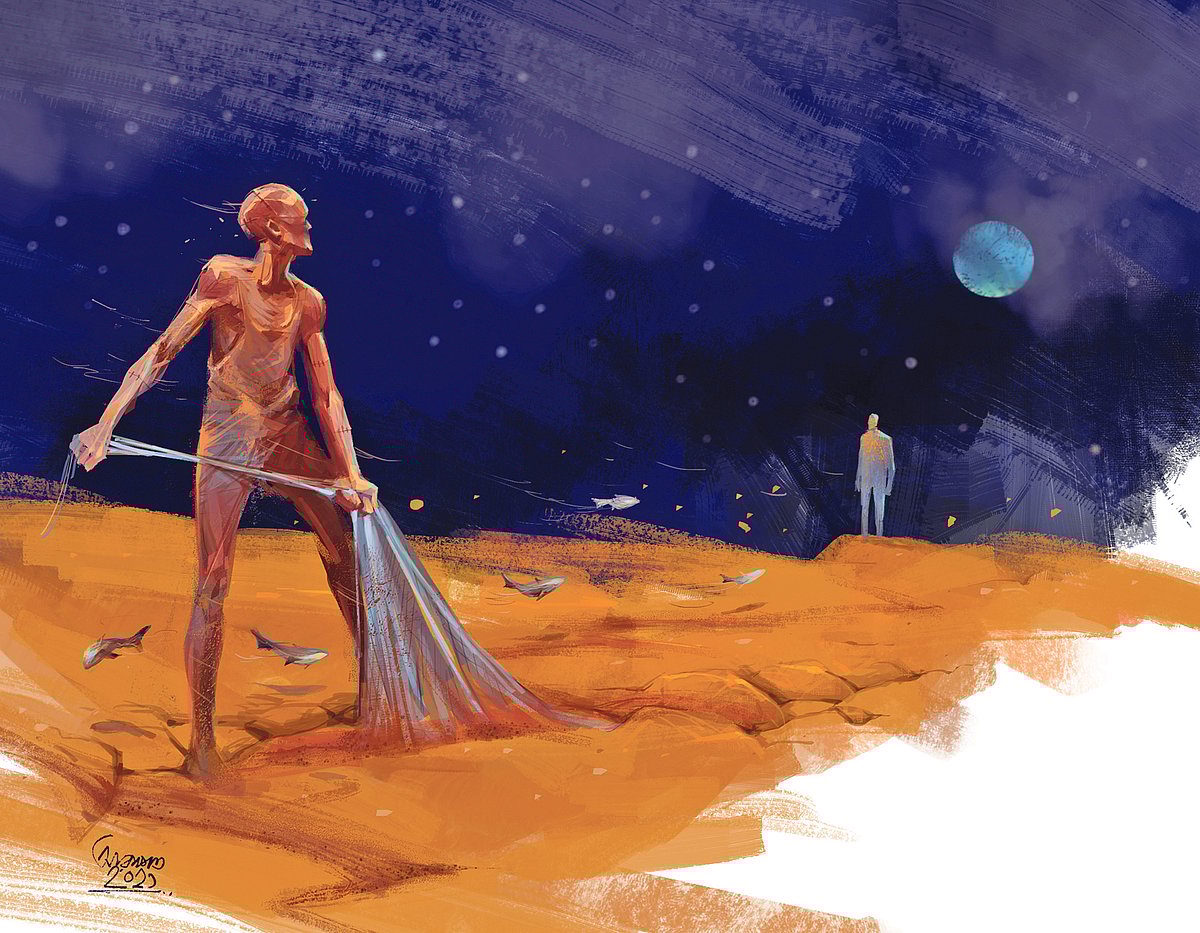 আমরা যখন কথা বলি, মঙ্গল গ্রহে তখন রাত নামে। সেখানেও বাতাস বয়, সেখান থেকেও মহাশূন্যে আকাশভরা তারা দেখা যায়। গ্রহের কিনার ঘেঁষে দাঁড়িয়ে আমি বলি, মানুষ বড় ক্লান্ত জেলেভাই। তার একটু বিশ্রাম দরকার। মানুষের জন্য মায়া হয় আমার। জেলেভাইকে একটা কবিতা শোনাতে ইচ্ছা হয়। আমি মঙ্গলের লাল মাটিতে, হাজার-ক্রোশী খালের পারে দাঁড়িয়ে আওড়াই: