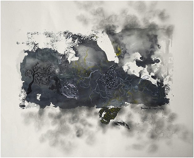 ‘অ্যাম্বিয়েন্ট সাইলেন্স’ সিরিজের আরেকটি ছবি। বিমূর্ত এই ক্যানভাসের ধূসর-নীলের ঘন কুণ্ডলী এক অন্ধকার সমুদ্রের মতো শ্বাস নেয়, যার চারপাশে নেগেটিভ স্পেস শূন্যতাকে অস্তিত্বের শক্তিতে রূপান্তরিত করে। যে শক্তির অন্তরালে আছে ধ্যানমগ্নতা। যা তৈরি হয়েছে ছবির গাঢ় রংগুলোর বাইরের হালকা ওয়াশের অংশগুলোতে। এখানে জলরঙের অনিয়ন্ত্রিত প্রবাহ ও ইঙ্কের ক্ষয়িষ্ণু স্তর মিলে তৈরি হয়েছে এক স্নায়ুতন্ত্র—যেখানে একাকী গাছের শিরা ও বিদ্যুৎ-রেখা জীবনের শেষ স্পন্দনকে ধরে রেখেছে।
