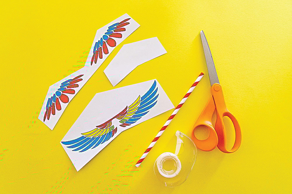 স্ট্রর একদিকে কাগজ লাগানো হয়েছে। এবার উল্টো দিকেও ঠিক একইরকম নকশা করা ডানা বসাও। ডানা বসানো হলে আগেরটি সঙ্গে স্কচটেপ দিয়ে সেঁটে দাও। মনে রেখো, নকশা তুমি তোমার ইচ্ছেমতো করতে পারো।