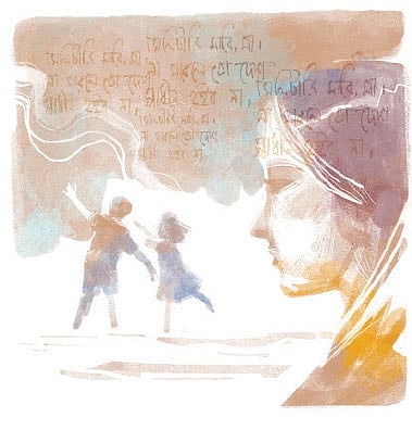 ‘যা, দুইজনকেই কিন্তু পিট্টি দেব।’ তাদের মা ডান হাত উঁচু করে মারের ভঙ্গি করে। দুই ভাইবোন এতে ভয় পেয়ে দৌড় দেয়। বাড়ির নিচের পুকুরঘাটে চলে আসে।