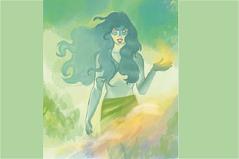 সামনে তাকাতেই দেখি সে দাঁড়িয়ে আছে। একটা মেয়ে। ২২ কি ২৩ বছর বয়স। পানপাতা মুখ। অসম্ভব সুন্দর দেখতে। চুলগুলো এসে পড়েছে নগ্ন বুকের ওপর। শরীরে শুধু শেওলা। চুলের ভেতর যেন বাষ্প। কিন্তু এতটুকুই! কোনো বড় বড় নখ নেই, দাঁত নেই, ডানা নেই! এমনকি রূপের এত তেজও নেই যে আমাদের চোখ পুড়ে যাবে। সাধারণ, খুবই সাধারণ একটা মেয়ে। ডাইনি তো নয়!
