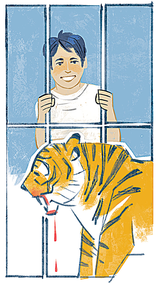 সেই রাতেই গ্রামে বাঘ এল। চারদিকে ছোটাছুটি শুরু হয়ে গেল। কেউ গ্রাম ছেড়ে পালাল, বাকিরা মরল বাঘের থাবায়। গোঁফ থেকে রক্ত চাটতে চাটতে বাঘ যখন জেলখানার পাশ দিয়ে যাচ্ছিল, দেখল মজবুত লোহার গরাদের ওপাশে রাখাল। রাগে গড়গড় করল বাঘ। কিন্তু নিরুপায়!