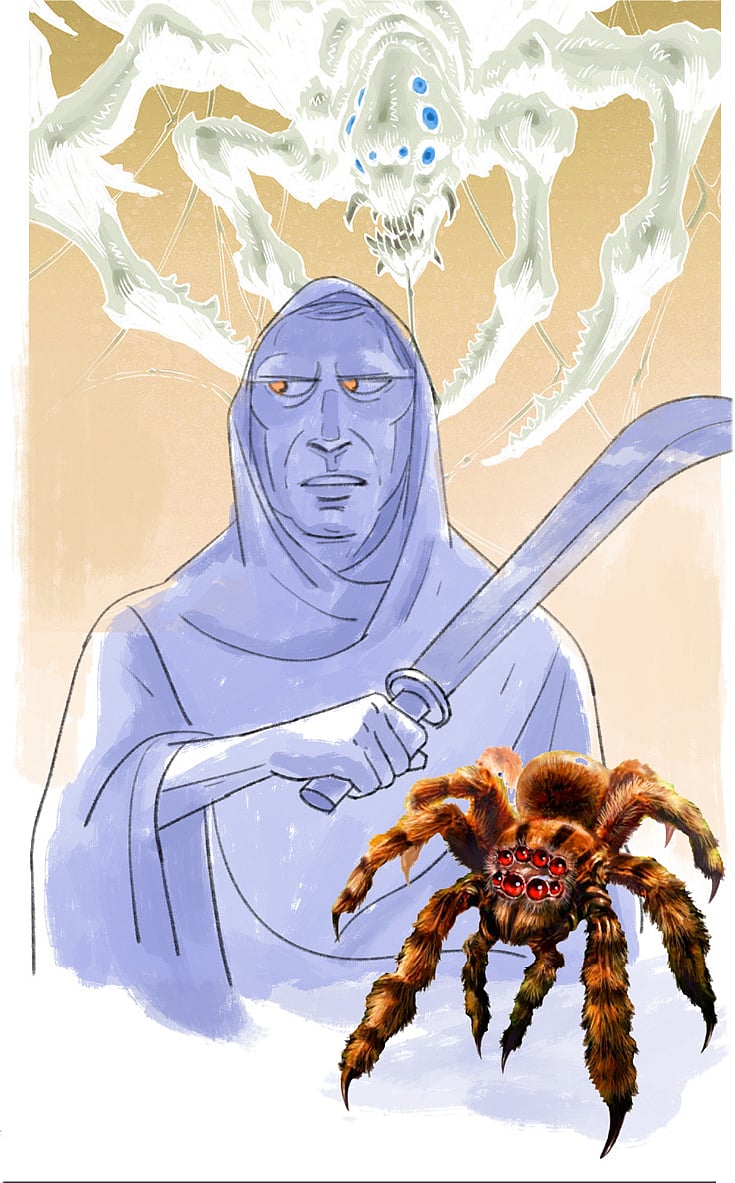 কুয়াশার অস্বচ্ছ আবরণের মধ্যে মাকড়া দেখল একটা প্রকাণ্ড মাকড়সা লোকটার জায়গায় বসে আছে। আট হাতের দুটি দড়ি দিয়ে বাঁধা। মাকড়া জানে সামান্য কসরতে ওই বাঁধন খুলে যাবে। জীবনে যে ব্যাপারটি তার সঙ্গে ঘটেনি, আজ সেটাই ঘটল। ভয়ে-আতঙ্কে গোঙাতে শুরু করল মাকড়া ডাকাত।