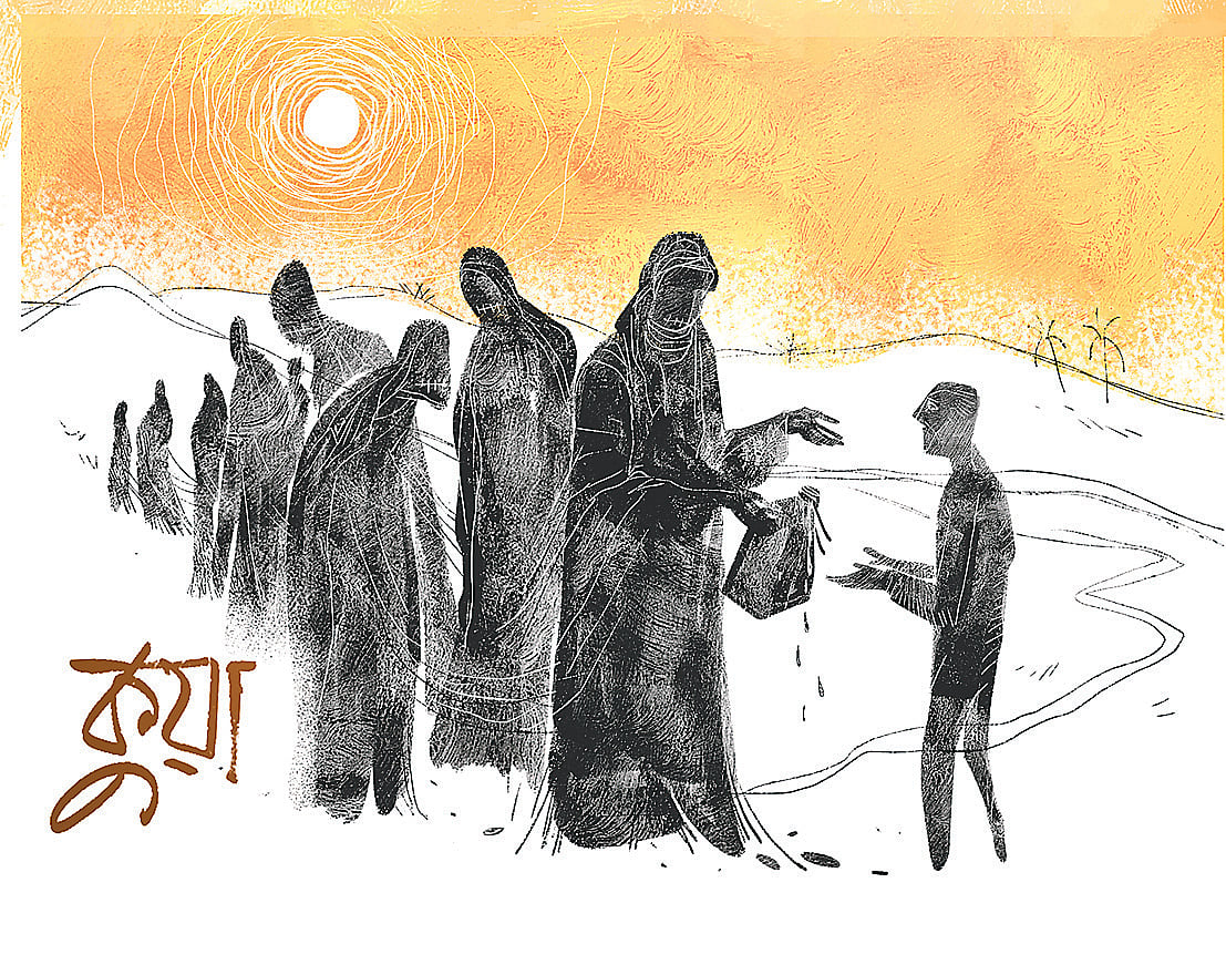 আমি তাই কনকনে শীতেও সাঁতার দিই, এত পথ আসতে পারছি, এটুকু নদী আর এমন কী? সুনসান নদী দাপড়ায়ে আমি অশান্ত বানায়া ফেলি, এত জোরে সাঁতরাই, কিন্তু কালো বোরকা পরা মানুষেরা ভ্রুক্ষেপ করে না। আমি সাঁতরাইতে থাকি, কিন্তু নাগরদোলার কাছে আর যাইতে পারি না। উল্টা দূরে দূরে সইরা যাই। নদীর পানি যেন পাথর হইয়া আমারে চাপ দিয়া ধরে, আমারই তৈরি করা ঢেউ নৃত্য শুরু করে আমার চারপাশে। আর আমি ধীরে ধীরে সাঁতরানোর শক্তি হারাইয়া ফেলি। নদীরে গাইল দিই, আম্মারে আমারে বাঁচানোর জন্য আকুতি জানাই, ঠিক যেমনটা জানাইছিলাম ছোট্ট শিশু থাকতে। কিন্তু নদী আমারে টাইনা ধইরা তার ভেতরে নিয়া যাইতে চায়, দম বন্ধ কইরা দেয়, টিপে ধরে গলা, ভাসায়ে নেয়—কোন অজানায়, এই কুয়ায়…।