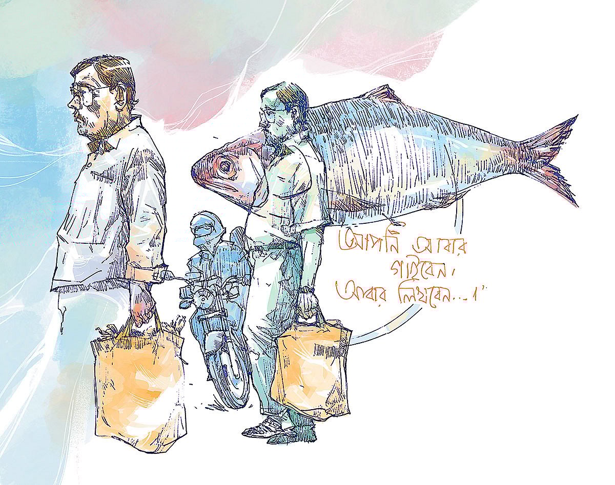 বড় ইলিশের হালি জানতে চাওয়া খদ্দেরের পাশে একটা ছেলে মাথায় ঝুড়ি নিয়ে দাঁড়িয়ে আছে। তাকে কাছে ডেকে খুব যত্নের সঙ্গে চারটে ইলিশ তুলে দিয়ে মাছওয়ালা বলল, ‘স্যার, কম দিয়েন না।’
