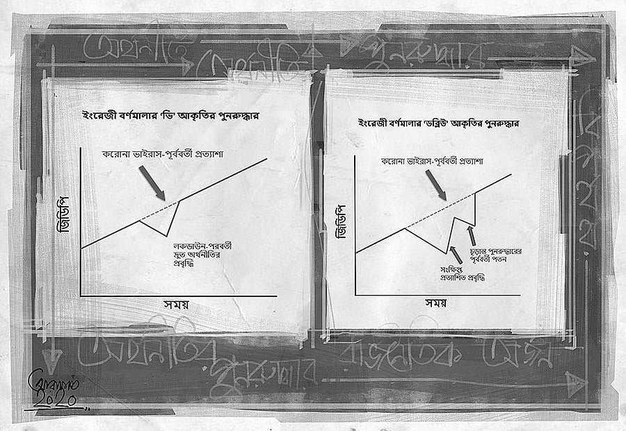 বিভিন্ন দেশে এ ধরনের বিপর্যয়ের পর অর্থনীতি পুনরুদ্ধারের তথ্য বিশ্লেষণ করে দেখা যায় যে এটা পাঁচটি সম্ভাব্য পথ অনুসরণ করে থাকে। ১. অর্থনীতি যদি দ্রুত পুনরুদ্ধার হয়, তাহলে তা হবে ইংরেজি বর্ণমালা ‘ভি’–এর মতো। অর্থাৎ দ্রুত খাদে নেমে আবার দ্রুত উঠে আসে। ২. বিপর্যয় যদি পরপর দুবার হয় এবং প্রতিবারই খাদ থেকে দ্রুত অর্থনীতি পুনরুদ্ধার হয়, তাহলে তা হবে ইংরেজি বর্ণমালা ‘ডব্লিউ’–এর মতো। ৩. অর্থনীতি পুনরুদ্ধার যদি বিলম্বিত হয়, তবে তা হবে ইংরেজি বর্ণমালা ‘ইউ’–এর মতো। অর্থাৎ দ্রুত উঠে না এসে বেশ কিছুটা সময় খাদে থেকে বেশ পরে অর্থনীতি আগের পর্যায়ে এসে আবার প্রবৃদ্ধি অর্জন করে। ৪. হতাশাজনক পরিস্থিতি হচ্ছে অর্থনীতি খাদ থেকে উঠতে না পেরে খাদেই অগ্রসর হতে থাকে, যা ইংরেজি বর্ণমালা ‘এল’–এর মতো। ৫. সবচেয়ে হতাশাজনক হচ্ছে ওপরে–নিচে দুটো ‘এল’ অর্থাৎ সিঁড়ির মতো খাদে পড়ার পর না উঠেই আবার খাদে পড়া এবং নিচের খাদেই অগ্রসর হতে থাকে।