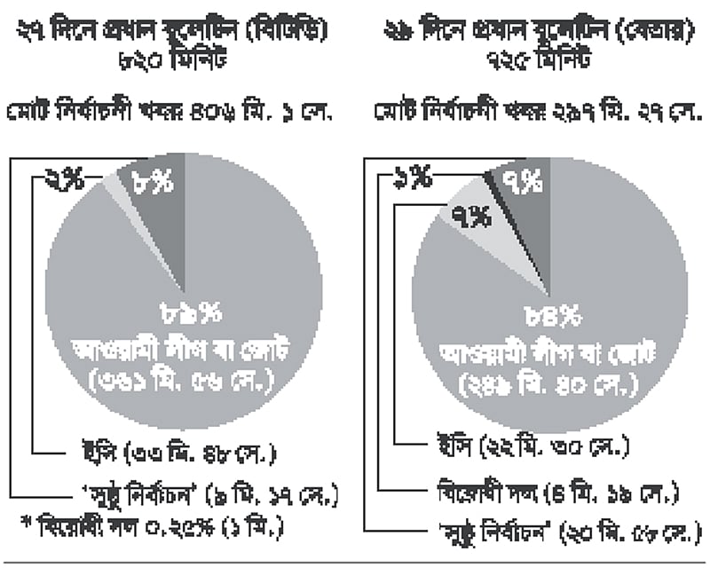 এক মিনিট আর চার মিনিট। একাদশ জাতীয় সংসদ নির্বাচনকেন্দ্রিক এক মাসে বাংলাদেশ টেলিভিশন আর বাংলাদেশ বেতারের প্রধান বুলেটিনে এই ছিল সরকারবিরোধী রাজনৈতিক দল ও জোটগুলোর খবরের মোট হিস্যা। আওয়ামী লীগ আর জোটসঙ্গীদের জন্য বরাদ্দ সময়ের সঙ্গে তুলনা করলে বিটিভির হিসাবটা দাঁড়ায় ৩৬১ মিনিট বনাম ১ মিনিট। আর বেতারে হিসাবটা ২৪৯ মিনিট বনাম ৪ মিনিট।