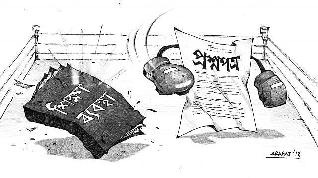 আমাদের কালের কথা। যে বছর পরীক্ষায় হৈমন্তীর চরিত্র বিশ্লেষণ করতে হতো, ঠিক তার পরের বছর কার চরিত্র বিশ্লেষণ করতে হবে সবাই বুঝে ফেলতাম। প্রশ্ন নকল হওয়ার ঐতিহাসিক সত্য মাথায় রেখেই এই লেখা। শিক্ষকতার সঙ্গে যুক্ত থাকার সুবাদে এ কথাও বুঝেছি, অনেক শিক্ষক রয়েছেন যাঁদের প্রণয়ন করা বিগত বছরগুলোর প্রশ্ন বিশ্লেষণ করলে দেখা যাবে, সব মিলিয়ে ১০ থেকে ১২টি প্রশ্ন তাঁরা তাঁদের শিক্ষকতার দীর্ঘ সময়ে ঘুরিয়ে-ফিরিয়ে করেছেন। শিক্ষকদের এই কর্মকাণ্ড বিশ্লেষণ করে এ কথাও অনুমান করা যায়, সামনের দিনগুলোতেও তাঁরা এই ধারা অব্যাহত রাখবেন। অভিজ্ঞতা থেকে বলা যায়, অনেক প্রশিক্ষণ বা বৈঠকে নতুন কিছু শেখানোর আয়োজন থাকলেও অনীহা দেখান এই ধারার পণ্ডিতেরা।