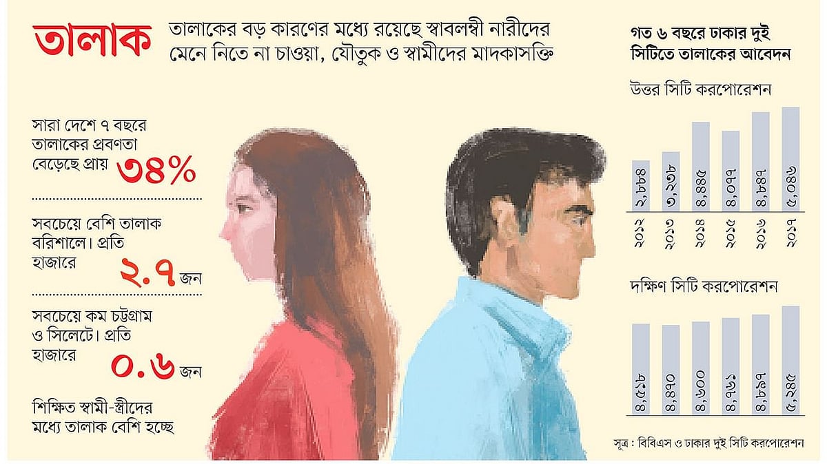 প্রথম আলোর প্রতিবেদনটির শিরোনাম ছিল ‘ঢাকায় দিনে ৩৯টি তালাক’। এর মূল বক্তব্য— বাংলাদেশে বিবাহবিচ্ছেদ বাড়ছে। এ বছরের গত পাঁচ মাসে গত বছরের একই সময়ের তুলনায় বিবাহবিচ্ছেদের হার ৩০ ভাগ বেশি। বিবাহবিচ্ছেদের ৭০ ভাগ আবেদনই এসেছে নারীদের পক্ষ থেকে। করোনাকালে বিচ্ছেদের ঘটনা বেশি ঘটছে। একই প্রতিবেদনে এ কথাও এসেছে যে আসলে করোনার আগেই অর্থাৎ ২০১৯ সালেও প্রতি মাসে গড়ে ৯২০টি তালাকের ঘটনা ঘটেছে।