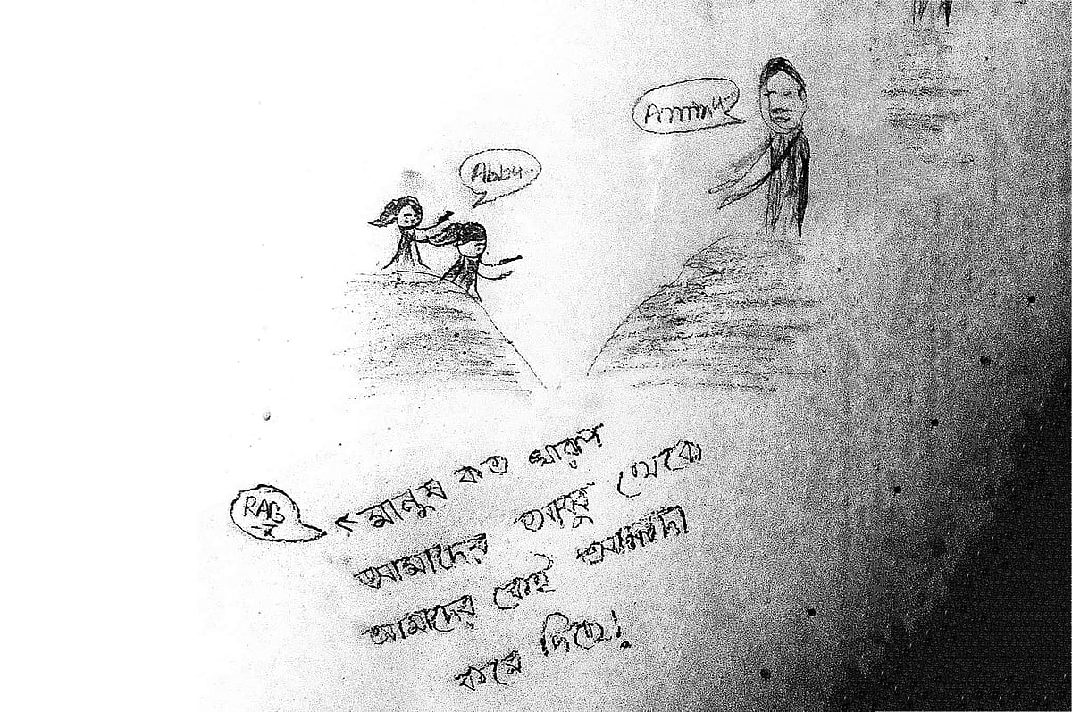 পথের পাশে দেয়ালে স্লোগান লিখতে যায়নি একরামুল হকের দুই মেয়ে তাহিয়াত ও নাহিয়ান। শুধু নিজেদের ঘরের দেয়ালে মার্কার কলম দিয়ে এলোমেলো লিখে রেখেছে ব্যথিত হৃদয়ের আকুতি, ‘আব্বু তুমি কোথায়?’ ‘তুমি কি আর জীবিত ফিরে আসবে না?’ ‘আব্বু তুমি কেন নাই?’ ‘আব্বু তুমি কখন আসবা, প্লিজ চলে আস।’ ‘মানুষ মানুষকে গুলি করে মারে।’ ‘নির্দোষ মানুষ কেন মরে?’