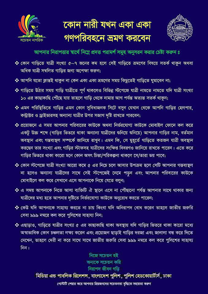 সম্প্রতি গণপরিবহনে নারীর নিরাপত্তা বিষয়ে দারুণ উদ্বেগ প্রতিফলিত হয়েছে বাংলাদেশ পুলিশের সচেতনতামূলক একটি প্রচারণা বার্তায়। বার্তাটি নারীকে উদ্দেশ করে লিখিত। বার্তাটিতে মূলত নারীকে সচেতন করা হয়েছে, তিনি যখন একা একা গণপরিবহনে ভ্রমণ করবেন, তখন তিনি তাঁর নিরাপত্তার স্বার্থে কী কী সাবধানতামূলক পদক্ষেপ গ্রহণ করবেন এ বিষয়ে। বার্তাটির উদ্দেশ্য ভালো, তাতে সন্দেহ নেই। কিন্তু যে কৌশলে বার্তাটি রচনা ও পরিবেশন করা হয়েছে, তাতে পুনর্বার প্রতিফলিত হয়েছে সেই সনাতনী পুরুষতান্ত্রিক ধ্যানধারণা; যে ধ্যানধারণা প্রতিষ্ঠা করে নারীর সমস্যা নিতান্তই নারীর একার। তাই তার সমাধানও চাপিয়ে দেওয়া হয়েছে নারীর ওপর। অপরাধ যারই হোক না কেন নারীর নিরাপত্তা রক্ষার সব দায়ভার যেন নারীর একার। সেখানে পুরুষের কোনো অংশগ্রহণ নেই, নেই কোনো অংশীদারত্ব।
