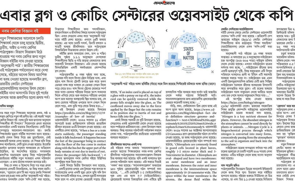 ২৯ জানুয়ারির প্রথম আলোতে প্রকাশিত একটি লেখায় নবম শ্রেণির বিজ্ঞান বইয়ে নকলের কিছু অভিযোগ আনা হয়েছে। ‘পাঠ্যপুস্তক: এবার ব্লগ ও কোচিং সেন্টারের ওয়েবসাইট থেকে কপি’ শিরোনামে এ লেখাটি লিখেছেন লেখক ও গবেষক নাদিম মাহমুদ।