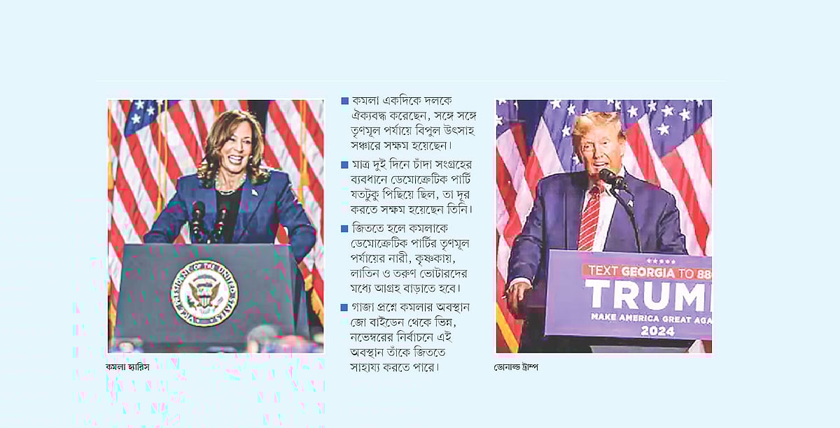 দ্বিতীয় কারণ, জিততে হলে কমলাকে ডেমোক্রেটিক পার্টির তৃণমূল পর্যায়ের নারী, কৃষ্ণকায়, লাতিন ও তরুণ ভোটারদের মধ্যে আগ্রহ বাড়াতে হবে। সাম্প্রতিক জনমত জরিপে দেখা গেছে, বাইডেন এই চার গ্রুপের সমর্থনই হারাচ্ছেন। শুধু তা–ই নয়, এদের উল্লেখযোগ্যসংখ্যক ভোটার হয় ট্রাম্পের দিকে ঝুঁকছেন, নয়তো ভোটের ব্যাপারে আগ্রহ হারিয়েছেন।