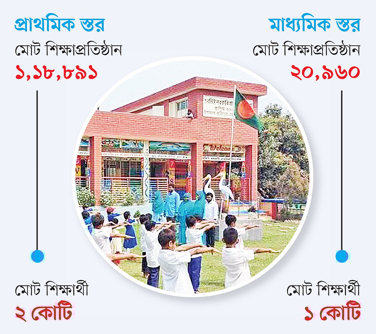 বাংলাদেশ শিক্ষাতথ্য ও পরিসংখ্যান ব্যুরোর (ব্যানবেইস) তথ্য বলছে, দেশে মাধ্যমিক স্তরে পড়ানো হয় ২০ হাজার ৯৬০ বিদ্যালয়ে। এগুলোতে মোট শিক্ষার্থী ১ কোটি ১ লাখের বেশি। অন্যদিকে সরকারি-বেসরকারি মিলিয়ে প্রাথমিক স্তরের ১ লাখ ১৮ হাজার ৮৯১ শিক্ষাপ্রতিষ্ঠান আছে। এগুলোতে মোট শিক্ষার্থী ২ কোটি ১ লাখের বেশি।