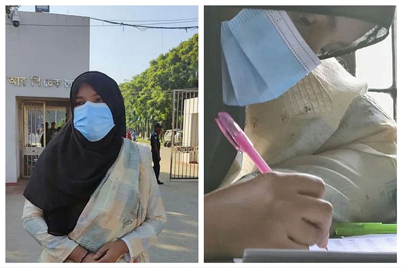 ওপরের ছবিটি খাদিজাতুল কুবরার। তিনি কোনো গুরুতর অপরাধ করেছেন, এ রকম প্রমাণ নেই। তারপরও ডিজিটাল নিরাপত্তা আইনে করা মামলায় ১৫ মাস জেল খাটতে হয়েছে। কাশিমপুর কারাগার থেকে বেরিয়ে খাদিজা বাড়ি যেতে পারেননি। তাঁকে জগন্নাথ বিশ্ববিদ্যালয়ে যেতে হয়েছে পরীক্ষা দিতে। পাশাপাশি দু্টি ছবির একটিতে দেখা যায়, খাদিজা কাশিমপুর কেন্দ্রীয় কারাগার থেকে বের হয়েছেন। সালোয়ার কামিজের সঙ্গে মাথায় কালো স্কার্ফ। অপর ছবিতে সেই পোশাকেই জগন্নাথ বিশ্ববিদ্যোলয়ে পরীক্ষার হলে বসে পরীক্ষা দিচ্ছেন।