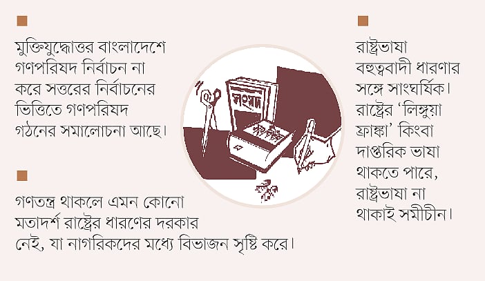 ■ মুক্তিযুদ্ধোত্তর বাংলাদেশে গণপরিষদ নির্বাচন না করে সত্তরের নির্বাচনের ভিত্তিতে গণপরিষদ গঠনের সমালোচনা আছে। ■ গণতন্ত্র থাকলে এমন কোনো মতাদর্শ রাষ্ট্রের ধারণের দরকার নেই, যা নাগরিকদের মধ্যে বিভাজন সৃষ্টি করে। ■ রাষ্ট্রভাষা বহুত্ববাদী ধারণার সঙ্গে সাংঘর্ষিক। রাষ্ট্রের ‘লিঙ্গুয়া ফ্রাঙ্কা’ কিংবা দাপ্তরিক ভাষা থাকতে পারে, রাষ্ট্রভাষা না থাকাই সমীচীন।