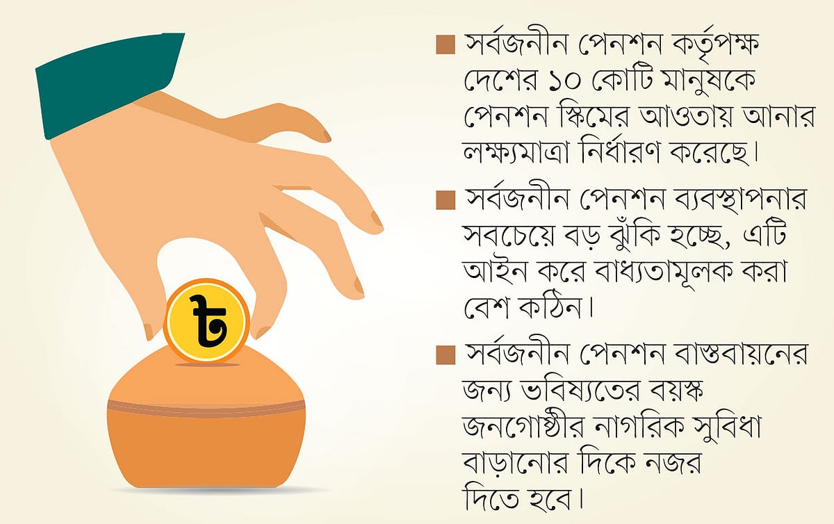 সর্বজনীন পেনশন বাস্তবায়নের জন্য ভবিষ্যতের বয়স্ক জনগোষ্ঠীর নাগরিক সুবিধা বাড়ানোর দিকে নজর দিতে হবে। অনানুষ্ঠানিক খাতে তো বটেই, বেসরকারি অনেক প্রতিষ্ঠানেই ন্যূনতম পেনশন সুবিধা নেই।