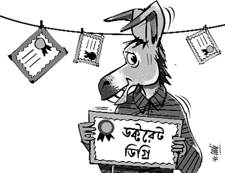 তাহলে দুর্বল ‘অভিসন্দর্ভ’? তা–ও মনে হয় না। বাকি রইল নকল বিশ্ববিদ্যালয় কিংবা ‘সম্মানসূচক পিএইচডি’। মজার কথা হচ্ছে আজকাল বিশ্ববিদ্যালয়ের বাইরে কিছু সংস্থাও নাকি ‘সম্মানসূচক পিএইচডি’ দিয়ে থাকেন, যার কোনো গ্রহণযোগ্যতা নেই। সেই ‘ঘোড়া আর গাধার পিএইচডি’–এর মতো।