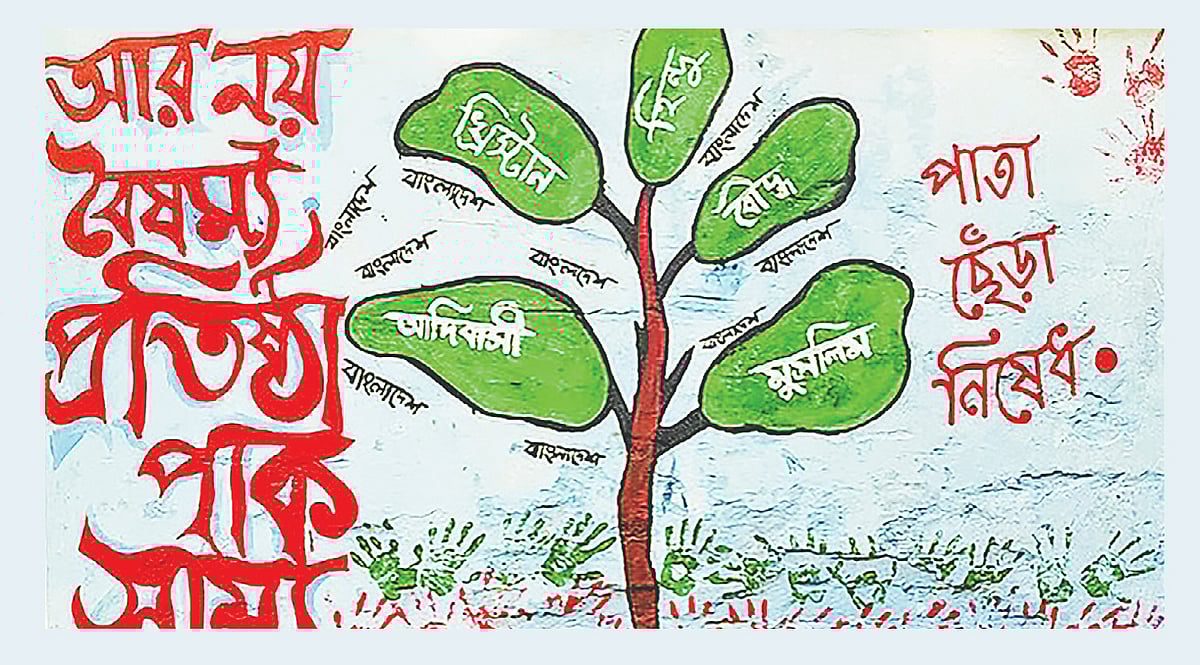 গ. ‘পাতা ছেঁড়া নিষেধ’—শিল্পী মামুন হোসাইনের আঁকা ছবিটি, দেয়ালে গ্রাফিতি আকারে দেখা গেছে, যেখানে একটি ছোট গাছে বেশ কয়েকটি পাতা রয়েছে, তার একেকটিতে লেখা মুসলিম, হিন্দু, বৌদ্ধ, খ্রিষ্টান, আদিবাসী। এখানেও অসাম্প্রদায়িক বাংলাদেশের সমগ্রকে ধরার চেষ্টা করা হয়েছে।