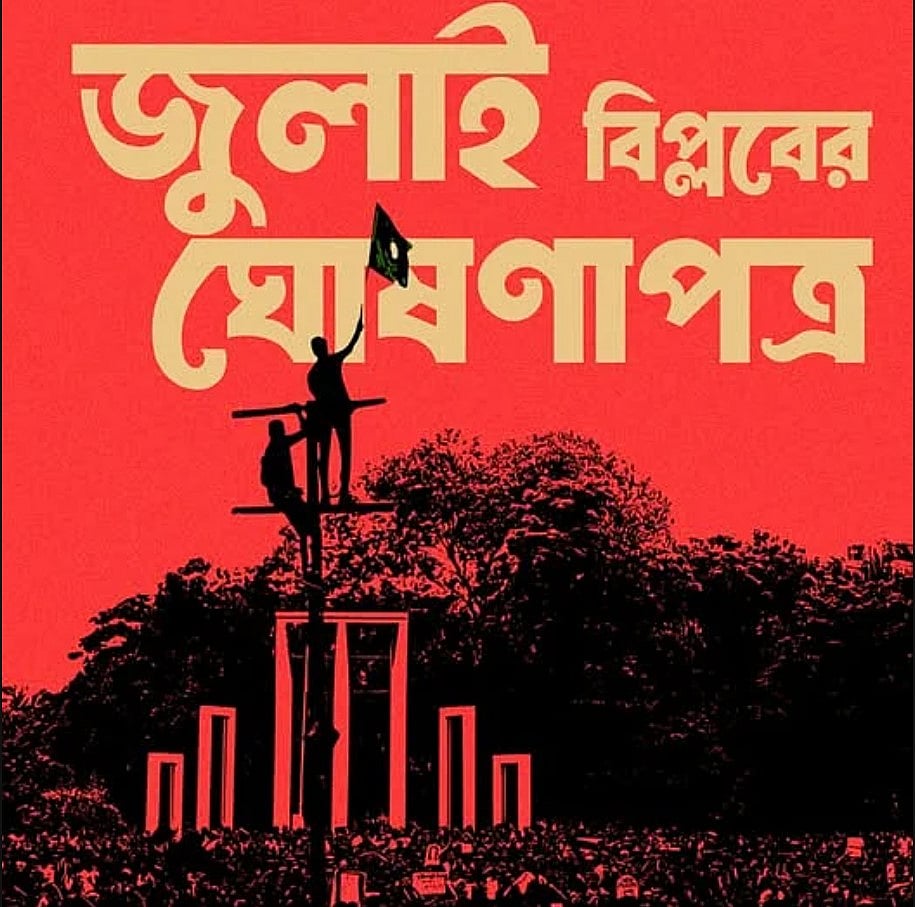 ‘বৈষম্যবিরোধী ছাত্র আন্দোলন’ নামের যে সংগঠনটি সরকারি চাকরিতে কোটা সংস্কারের দাবিতে আন্দোলন শুরু করেছিল এবং পরে বিভিন্ন পক্ষের সঙ্গে সমন্বয় করে রাজনৈতিক পরিবর্তনের আন্দোলনকে এগিয়ে নিয়েছিল, সেই সংগঠনটি এবং ফ্যাসিবাদবিরোধী আন্দোলনে সমর্থন দেওয়া প্রধান রাজনৈতিক দল বাংলাদেশ জাতীয়তাবাদী দল (বিএনপি) এবং ইসলামি রাজনৈতিক শক্তিগুলো এখন পর্যন্ত কোনো আনুষ্ঠানিক বিপ্লবী ঘোষণাপত্র বা রূপরেখা প্রকাশ করেনি, যা জনগণের আকাঙ্ক্ষাকে বাস্তবে রূপ দেওয়ার দিকনির্দেশনা দিতে পারে।