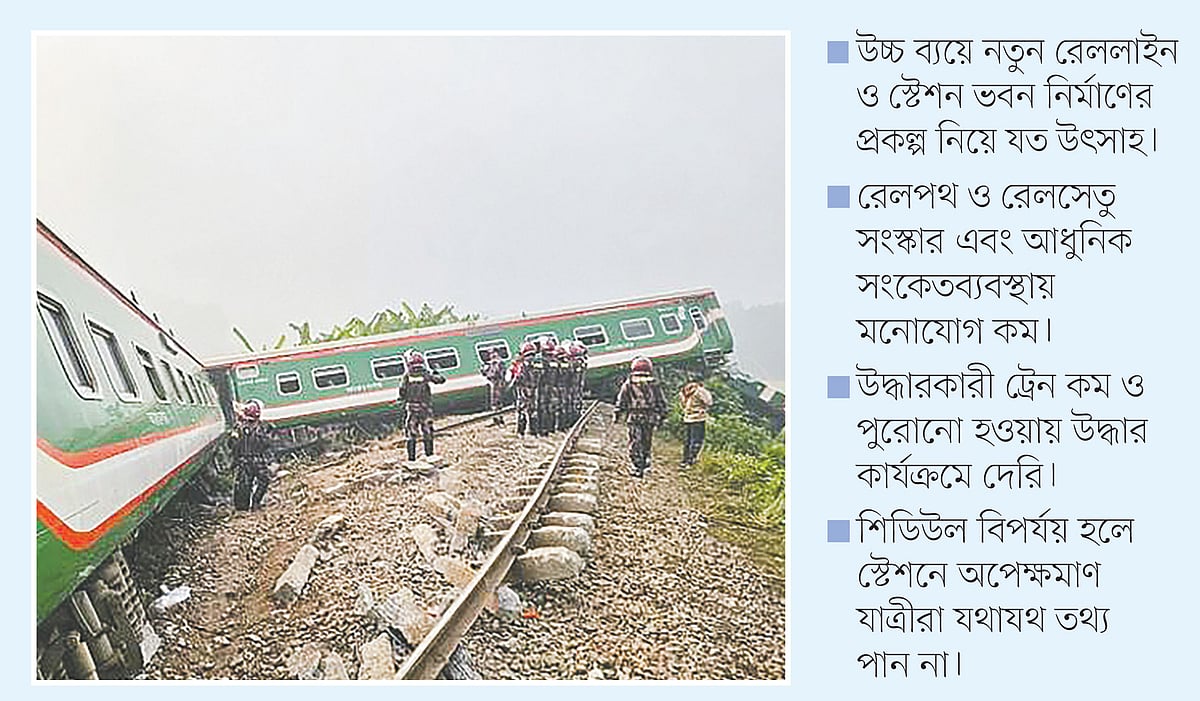 উচ্চ ব্যয়ে নতুন রেললাইন ও স্টেশন ভবন নির্মাণের প্রকল্প নিতে যতটা উৎসাহ দেখা যায়, ততটাই নিরুৎসাহ বিদ্যমান রেলপথ ও রেলসেতু সংস্কারে। ফলে সারা দেশে ৩ হাজার ৪০০ কিলোমিটারের বেশি রেললাইনের মধ্যে মানসম্পন্ন রেললাইন মাত্র ১ হাজার কিলোমিটার। (ইত্তেফাক, ২১ মার্চ ২০২৪)