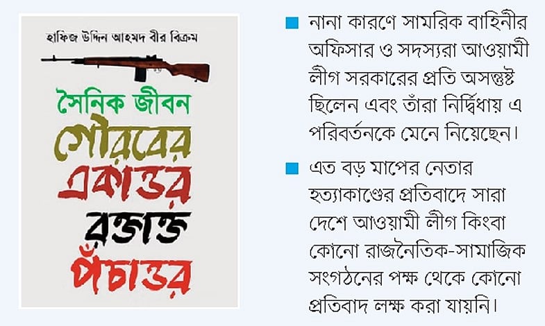 সৈনিক জীবন: গৌরবের একাত্তর রক্তাক্ত পঁচাত্তর বইয়ের লেখক হাফিজ উদ্দিন আহমদ। প্রথমা প্রকাশন থেকে প্রকাশিত আত্মজৈবনিক বইটিতে রণাঙ্গনে মুক্তিযুদ্ধ, যুদ্ধোত্তর বাংলাদেশ, শেখ মুজিবুর রহমানের নির্মম হত্যাকাণ্ড এবং সেনাবাহিনীর ভেঙে পড়া চেইন অব কমান্ড পুনরুদ্ধারের চেষ্টা—এসব ঘটনার বিস্তারিত বয়ান রয়েছে। এ বইয়ের প্রাসঙ্গিক কিছু অংশ প্রথম আলোর পাঠকদের জন্য প্রকাশ করা হলো।