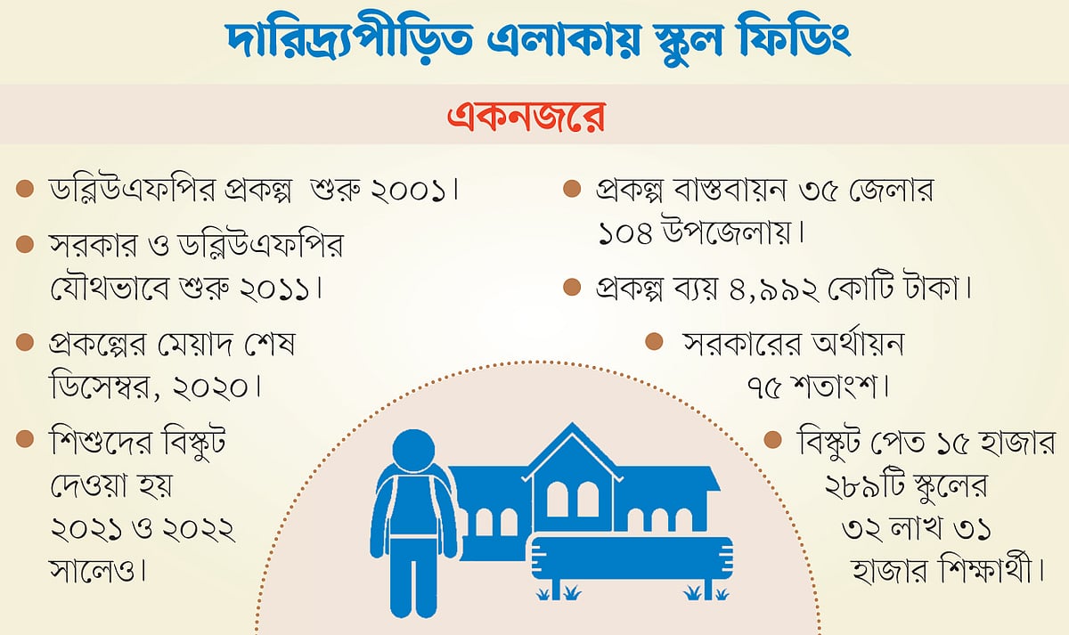প্রকল্পটির আওতায় শিশুশিক্ষার্থীদের ৭৫ গ্রাম করে ফর্টিফায়েড বিস্কুট (১০টি) দেওয়া হতো। এ বিস্কুট একেকটি শিশুকে প্রতিদিন ৩৩৮ কিলোক্যালরি করে শক্তি জুগিয়েছে। ২১ বছর ধরে চলা সেই কার্যক্রম গত বছরের জুনে বন্ধ হয়ে যায়।