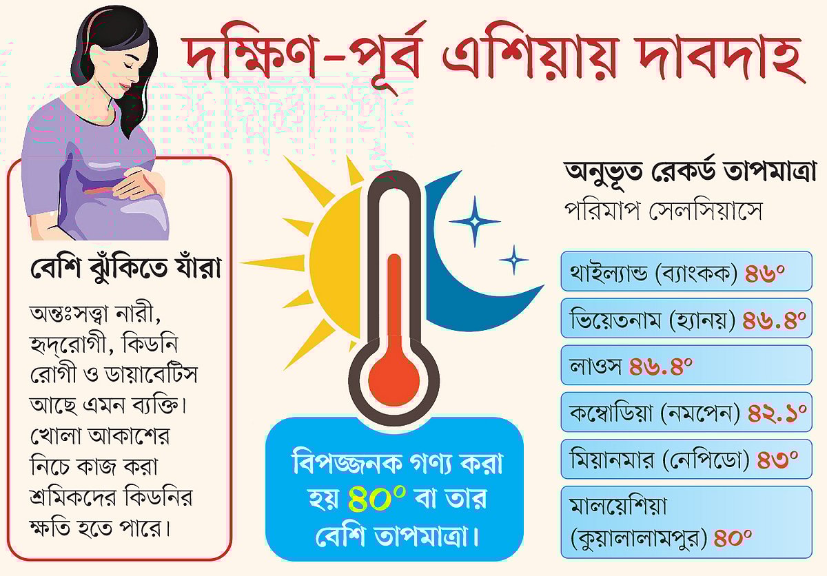 কোপারনিকাস জলবায়ু পরিবর্তন সেবার তথ্য বিশ্লেষণে দেখা গেছে, দক্ষিণ–পূর্ব এশিয়ার ছয়টি দেশ (থাইল্যান্ড, ভিয়েতনাম, কম্বোডিয়া, লাওস, মালয়েশিয়া ও মিয়ানমার) এপ্রিলের শুরু এবং মে মাসের শেষের দিকে প্রতিদিন ৪০ ডিগ্রি সেলসিয়াস বা এর বেশি তাপমাত্রা অনুভূত হয়েছে। এই মাত্রাকে বিপৎসীমার ওপরে গণ্য করা হয়। বিশেষ করে স্বাস্থ্য সমস্যা রয়েছে এবং এমন গরমে অভ্যস্ত নয়—এমন ব্যক্তিদের ঝুঁকি বেশি।