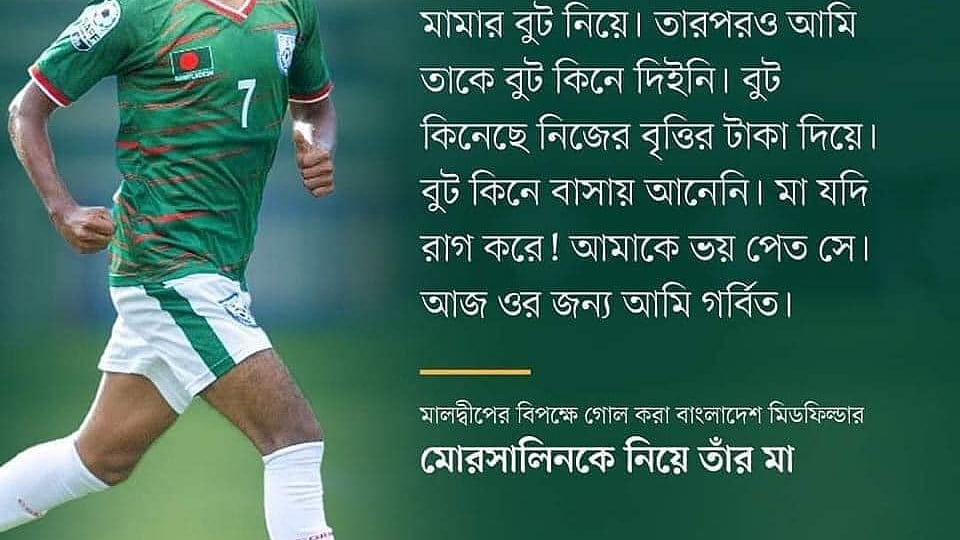 গল্পটা মনে পড়ল বাংলাদেশের তরুণ ফুটবলার মোরসালিনের সাফল্যে তাঁর মায়ের গর্ব আর সেই গর্বের বিপরীতে সামাজিক যোগাযোগমাধ্যমে তাঁকে আক্রমণ করা নিয়ে। বাংলাদেশ পুরুষ ফুটবল দল ২০ বছর পর গতকাল মালদ্বীপকে হারাতে পেরেছে। খেলার শেষ দিকে আঠারো বছরের তরুণ মোরসালিন এক চোখধাঁধানো গোল করে জয় নিশ্চিত করেন। আমার সহকর্মী, প্রথম আলোর সিনিয়র সাংবাদিক মাসুদ আলম এর পরপরই মোরসালিনের মায়ের অনুভূতি জানতে চান।