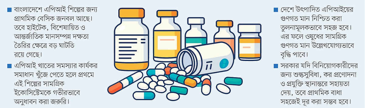 অর্থাৎ ওষুধশিল্প দেশের জিডিপিতে যে অবদান রাখছে, তার একটি বড় অংশই এপিআই আমদানিনির্ভর হওয়ায় দেশের বাইরে চলে যাচ্ছে। আবার আমদানিনির্ভর হওয়ার কারণে এপিআইয়ের গুণগত মান নিশ্চিত করা যাচ্ছে না। তা ছাড়া এপিআইয়ের এই আমদানিনির্ভরতা এলডিসি গ্র্যাজুয়েশনের পর দেশের ওষুধশিল্প খাতের জন্য একটি বড় চ্যালেঞ্জ হয়ে দাঁড়াবে।