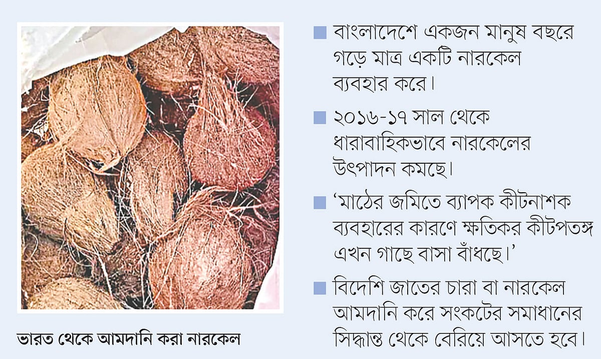 সব সমস্যার কিছু না কিছু সমাধান আছে। বিদেশি জাতের চারা আমদানি করে বাংলাদেশের নারকেল-সংকটের সমাধানের সিদ্ধান্ত থেকে বেরিয়ে আসতে হবে। এ দেশে ভালো জাত নেই, এটা বৈজ্ঞানিকভাবে প্রমাণিত নয়। ফলন, আকার আর স্বাদের দিক থেকে একসময় শ্রেষ্ঠ ছিল গোপালগঞ্জের কাশিয়ানি এলাকার ডাব-নারকেল। সেখানকার নারকেল নিয়ে আমাদের গবেষণা বড়ই সীমিত।