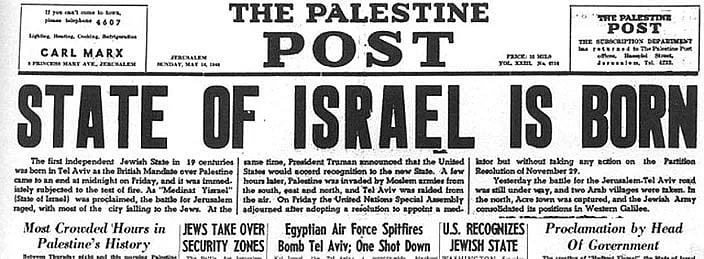 ১৯৪৮ সালের ১৪ মে ফিলিস্তিনে ব্রিটিশ ম্যানডেট বা শাসন শেষ হলে বেন গুরিয়ান আনুষ্ঠানিকভাবে স্বাধীন ইসরায়েল রাষ্ট্র ঘোষণা করেন। মার্কিন প্রেসিডেন্ট ট্রুম্যান সঙ্গে সঙ্গে একে স্বীকৃতি দেন। আর আল নাকবা বা মহাবিপর্যয় নেমে আসে ফিলিস্তিনিদের ওপর। নিজ ঘরবাড়ি ছেড়ে নিঃস্ব অবস্থায় রাতারাতি লাখ লাখ ফিলিস্তিনি প্রাণ রক্ষায় ছুটে পালাতে থাকে। তাই ১৫ মে আল নাকবা (বিপর্যয়) দিবস বিবেচিত হয়।