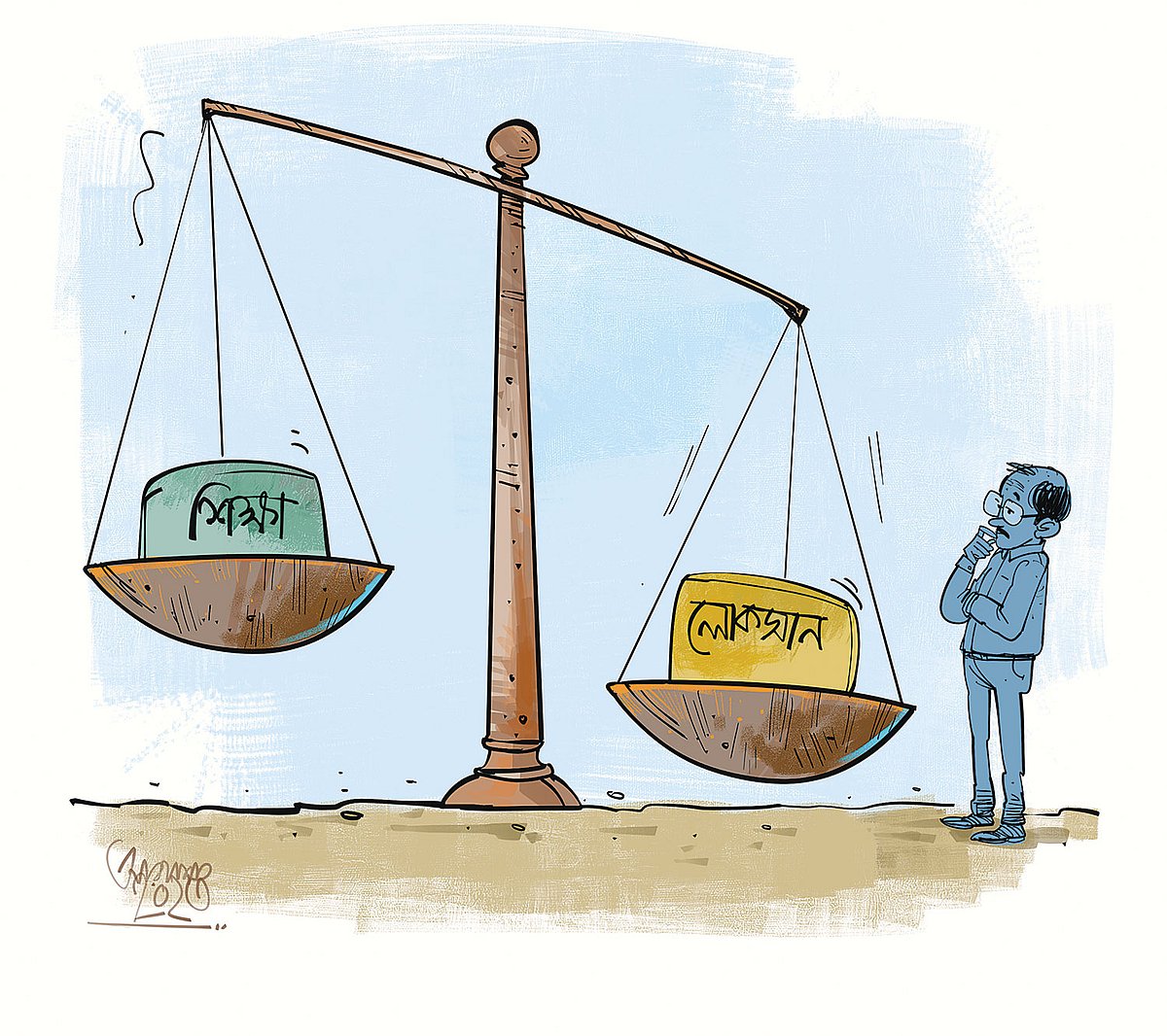 চলমান শিক্ষার উদ্দেশ্যের সীমাবদ্ধতা সম্পর্কে আমরা সবাই জানি। বাংলাদেশের প্রায় পাঁচ কোটি স্কুলশিক্ষার্থীর জন্য প্রয়োজনীয়সংখ্যক ও উপযুক্ত মানের শিক্ষক নিয়োগ করা যায়নি। শিক্ষক-শিক্ষার্থী সংযোগ ক্রমেই ক্ষীণ ও মানহীন, প্রায় যান্ত্রিক হয়ে পড়েছে। ফলে পড়াশোনার অর্থ দাঁড়াল শিক্ষক বা কোচের নির্বাচিত গুটিকয় প্রশ্নের শিক্ষক-কোচ রচিত নির্দিষ্ট উত্তর মুখস্থ করে পরীক্ষায় যথাযথভাবে লিখে দেওয়া। অন্যের প্রশ্নের অন্যের উত্তর মুখস্থ করে কারও পক্ষে শিক্ষার্থী থাকা সম্ভব নয়। রবীন্দ্রনাথ এমন শিক্ষার প্রতি ইঙ্গিত করে তাঁর স্কুলশিক্ষার সবটাকেই ‘লোকসানি মাল’ আখ্যা দিয়েছিলেন। দেখা যাচ্ছে জাতিগতভাবে দিনে দিনে আমাদের লোকসান কেবল বেড়েই চলেছে। কথা হলো আর কত লোকসান আমরা গুনব।