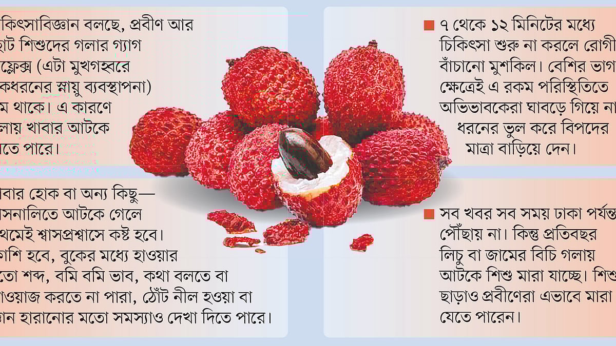 সব খবর সব সময় ঢাকা পর্যন্ত পৌঁছায় না। কিন্তু প্রতিবছর লিচু বা জামের বিচি গলায় আটকে শিশু মারা যাচ্ছে। শিশু ছাড়াও প্রবীণেরা এভাবে মারা যেতে পারেন।