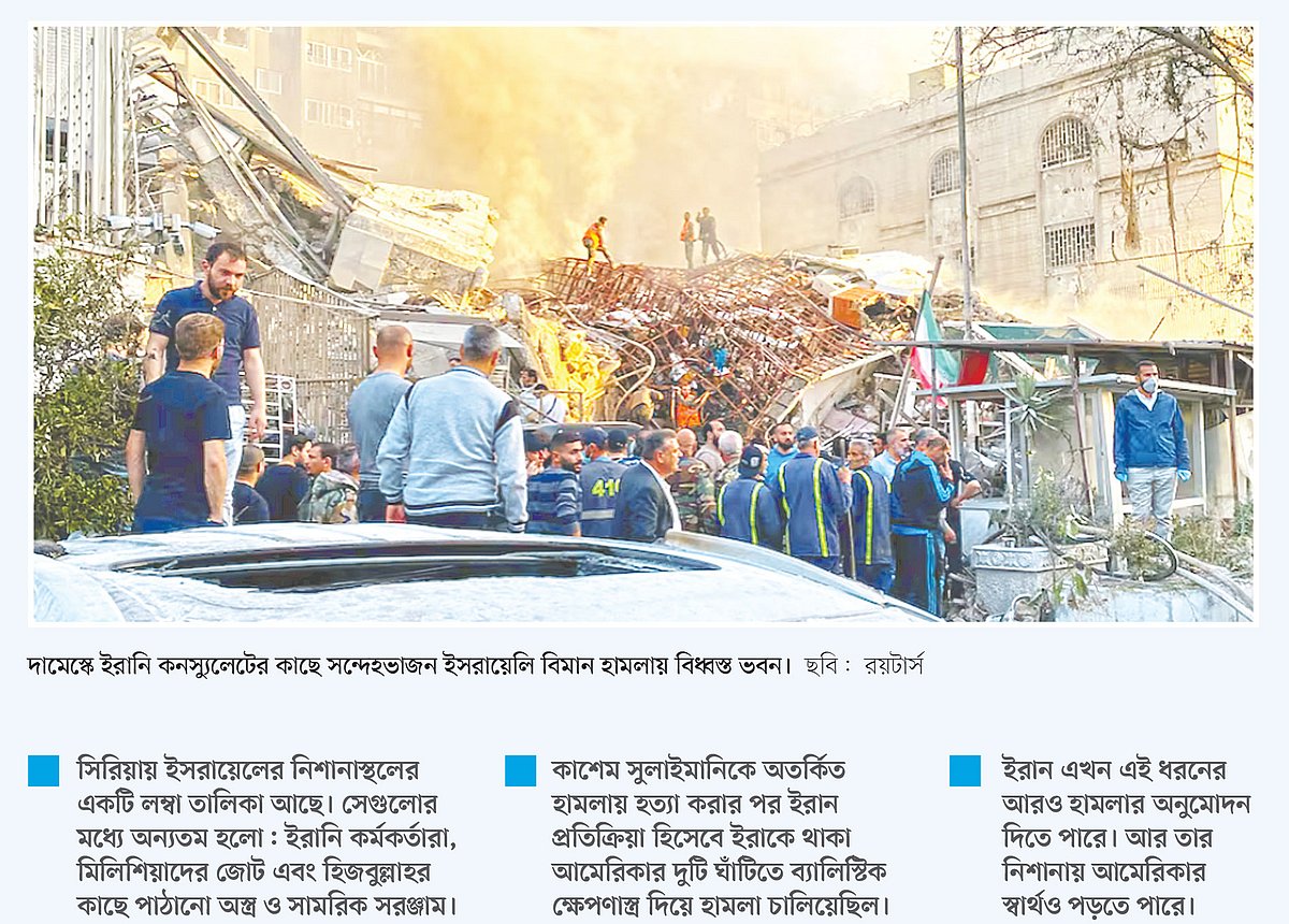 গত পয়লা এপ্রিল সিরিয়ার রাজধানী দামেস্কে ইরানি দূতাবাস চত্বরের ভেতরের একটি ভবনে সন্দেহভাজন ইসরায়েলি বিমান থেকে বোমা ফেলা হয়। বোমায় ভবনটি মাটির সঙ্গে মিশে গেছে। ওই হামলায় সাতজন নিহত হয়েছেন। তাঁদের মধ্যে ইরানের বেশ কয়েকজন উচ্চ পদস্থ কর্মকর্তা আছেন।