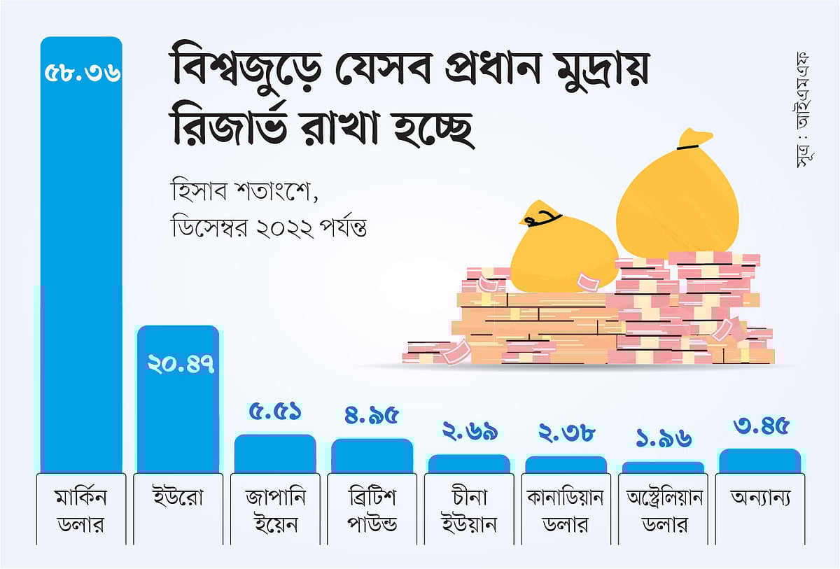 ডলার নিয়ে এসব আলোচনা-বিতর্ক জোরালো হয়েছে শীর্ষস্থানীয় মুদ্রাবিশেষজ্ঞ স্টিভেন জেনের বক্তব্যের সূত্র ধরে। এপ্রিল মাসে তিনি একটি গবেষণা নোট প্রকাশ করে বলেন, রিজার্ভ মুদ্রা হিসেবে ২০২২ সালে ডলারের ‘বিস্ময়কর পতন’ ঘটেছে। আর এর জন্য তিনি দায়ী করেন নিষেধাজ্ঞা আরোপকে। স্টিভেন জেন সামষ্টিক অর্থনীতি বিশ্লেষণকারী প্রতিষ্ঠান ইউরিজন এসএলজের প্রধান নির্বাহী। তিনি ‘ডলার স্মাইল’ তত্ত্বের জনক। মার্কিন অর্থনীতি খুব শক্তিশালী কিংবা খুব দুর্বল থাকলে ডলারের মূল্য বাড়ে—এ–ই হলো ওই তত্ত্বের মোদ্দাকথা। তিনিই প্রথম বলেন, বিনিময় হারের উত্থান–পতনকে বিবেচনায় নিয়ে হিসাব করলে দেখা যায়, গত বছর বৈশ্বিক রিজার্ভে ডলারের হিস্যা ৪৭ শতাংশে নেমে এসেছে। আন্তর্জাতিক মুদ্রা তহবিলের (আইএমএফ) হিসেবে অবশ্য বিশ্বে এখনো ৫৮ শতাংশের বেশি রিজার্ভ মার্কিন ডলারে রাখা হয়। তবে ডলারের হিস্যা যে কমছে, তা নিয়ে কারও দ্বিমত নেই। এমনকি আইএমএফ ডলারে রাখা রিজার্ভের যে হিসাব দিচ্ছে, তা–ও ১৯৯৯ সালের পর সবচেয়ে কম।