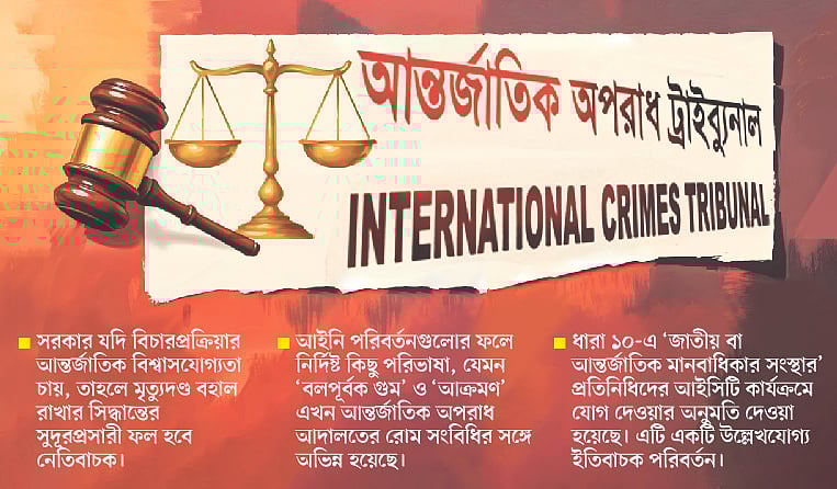 ■ সরকার যদি বিচারপ্রক্রিয়ার আন্তর্জাতিক বিশ্বাসযোগ্যতা চায়, তাহলে মৃত্যুদণ্ড বহাল রাখার সিদ্ধান্তের সুদূরপ্রসারী ফল হবে নেতিবাচক। ■ আইনি পরিবর্তনগুলোর ফলে নির্দিষ্ট কিছু পরিভাষা, যেমন ‘বলপূর্বক গুম’ ও ‘আক্রমণ’ এখন আন্তর্জাতিক অপরাধ আদালতের রোম সংবিধির সঙ্গে অভিন্ন হয়েছে। ■ ধারা ১০-এ ‘জাতীয় বা আন্তর্জাতিক মানবাধিকার সংস্থার’ প্রতিনিধিদের আইসিটি কার্যক্রমে যোগ দেওয়ার অনুমতি দেওয়া হয়েছে। এটি একটি উল্লেখযোগ্য ইতিবাচক পরিবর্তন।