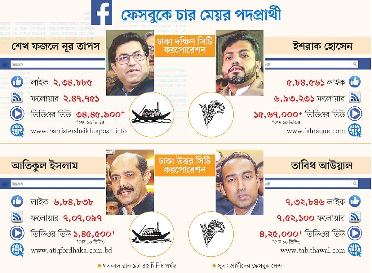 ঢাকার দুই সিটি করপোরেশনে মেয়র পদে এবার ১৩ জন এবং কাউন্সিলর পদে (সংরক্ষিতসহ) ৭৯৬ জন প্রতিদ্বন্দ্বিতা করছেন। তবে মেয়র পদপ্রার্থীদেরই অনলাইনে প্রচার-প্রচারণা সবচেয়ে বেশি। তা ছাড়া অনেক কাউন্সিলর পদপ্রার্থী ও তাঁদের সমর্থকেরাও অনলাইনে সরব উপস্থিতির জানান দিচ্ছেন।
