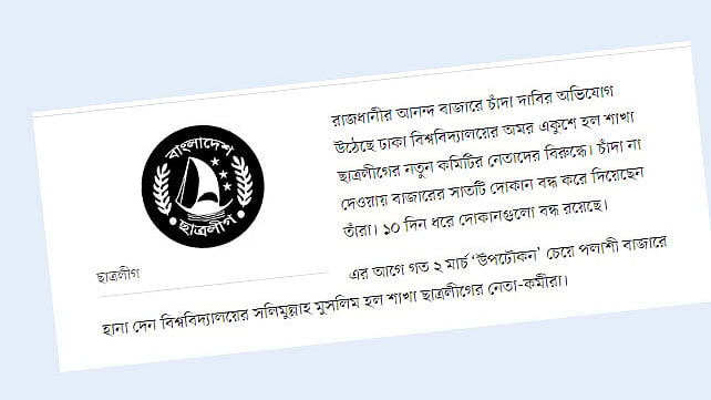 গতকাল সোমবার ‘আনন্দ বাজারে চাঁদা দাবি ছাত্রলীগের, বন্ধ ৭ দোকান’ শিরোনামে প্রথম আলো অনলাইনে প্রকাশিত এক প্রতিবেদনে বলা হয়, ঢাকা বিশ্ববিদ্যালয়ের অমর একুশে হল শাখা ছাত্রলীগের নতুন কমিটির নেতাদের বিরুদ্ধে ব্যবসায়ীদের অভিযোগ, এককালীন ১০ লাখ ও প্রতি মাসে ১ লাখ টাকা চাঁদা দিতে রাজি না হওয়ায় বাজারের ৭টি দোকান বন্ধ করে দিয়েছে ছাত্রলীগ। চাঁদা না পেলে ব্যবসায়ীদের প্রাণনাশের হুমকিও দেন ছাত্রলীগের নেতারা।