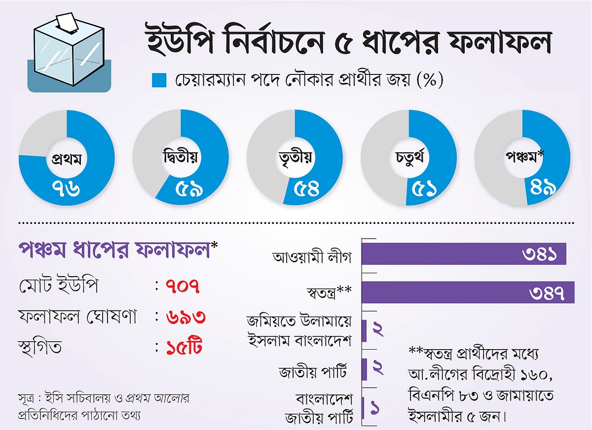 পঞ্চম ধাপে গত বুধবার দেশের ৭০৭টি ইউপিতে নির্বাচন হয়। এর মধ্যে ১৫টি ইউপির ফলাফল প্রকাশিত হয়নি। নির্বাচন কমিশন (ইসি) সচিবালয় গতকাল বৃহস্পতিবার ৬৯২টি ইউপির চেয়ারম্যান পদের ফলাফলের তথ্য দিয়েছে। এর মধ্যে আওয়ামী লীগ জয় পেয়েছে ৩৪১টিতে। আর স্বতন্ত্র প্রার্থীরা জিতেছেন ৩৪৬টিতে। এ ধাপে ৫০ শতাংশ ইউপিতে জয় পেয়েছেন স্বতন্ত্র প্রার্থীরা। অবশ্য এ ধাপে ৪৭টি ইউপিতে আওয়ামী লীগ দলীয় প্রার্থী দেয়নি। এসব ইউপিতে আওয়ামী লীগের নেতারা স্বতন্ত্র প্রার্থী হিসেবে নির্বাচন করেছেন।