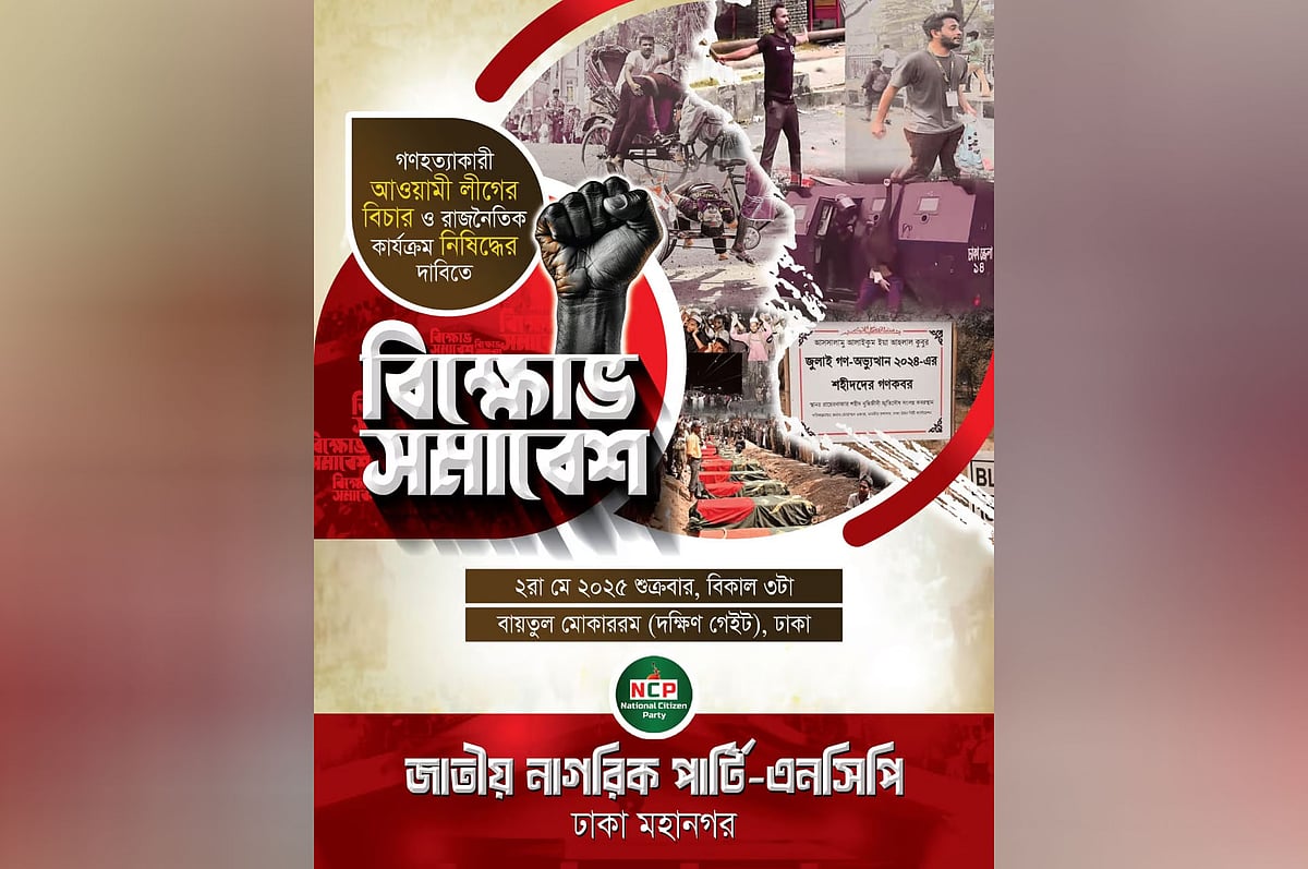 ‘গণহত্যাকারী আওয়ামী লীগের বিচার ও রাজনৈতিক কার্যক্রম নিষিদ্ধের দাবিতে’ আগামী ২ মে (শুক্রবার) রাজধানী ঢাকায় বিক্ষোভ সমাবেশ করবে নতুন দল জাতীয় নাগরিক পার্টি (এনসিপি)। রাজধানীর গুলিস্তানে জাতীয় মসজিদ বায়তুল মোকাররমের দক্ষিণ ফটকে এনসিপির ঢাকা মহানগর শাখার উদ্যোগে এই সমাবেশ হবে।