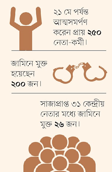 সংশ্লিষ্ট সূত্রগুলো বলছে, নির্বাচনের পর পুলিশের ধরপাকড় কমে আসায় সাজা হওয়া নেতা–কর্মীদের অনেকে আদালতে আত্মসমর্পণ করতে শুরু করেছেন। ২১ মে পর্যন্ত প্রাপ্ত তথ্য অনুযায়ী, আত্মসমর্পণকারী নেতা-কর্মীর সংখ্যা প্রায় ২৫০। তাঁদের মধ্যে জামিনে মুক্ত হয়েছেন ২০০ জনের মতো। আর কেন্দ্রীয় নেতাদের মধ্যে জামিনে মুক্ত হয়েছেন ২৬ জন, ৫ জন এখনো কারাগারে।