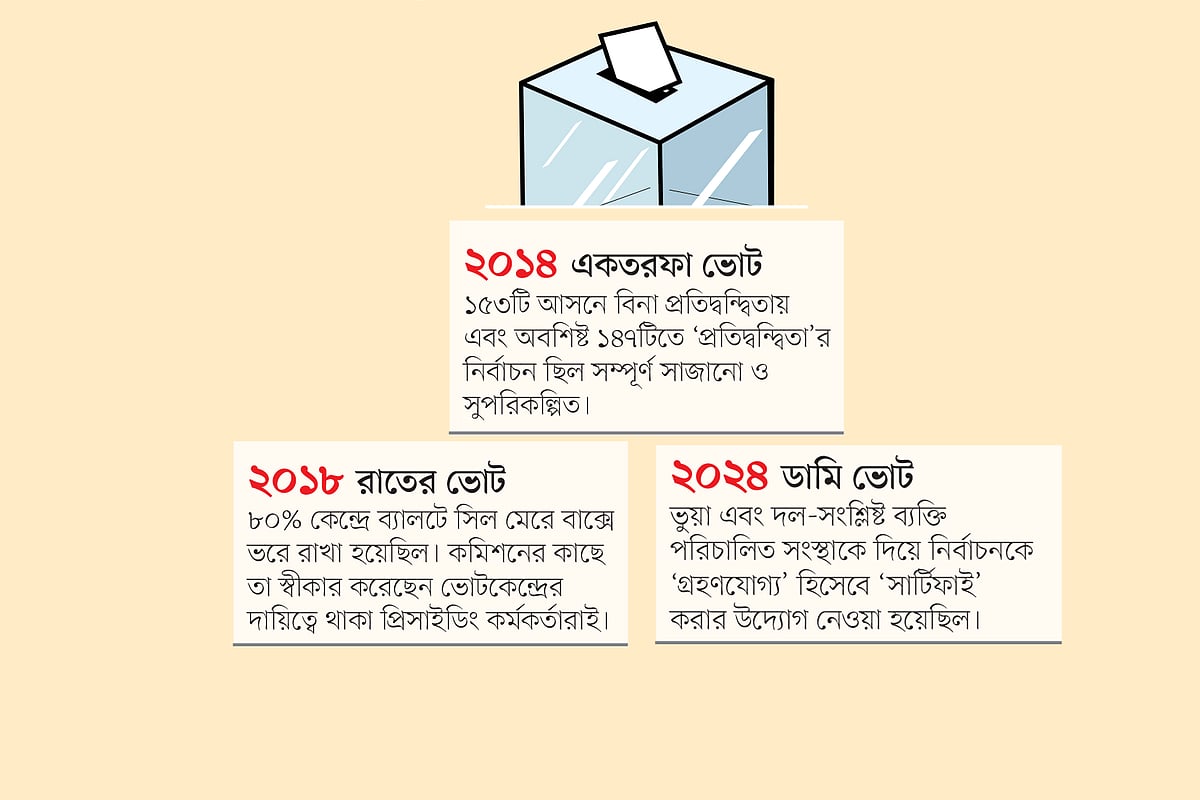ভুয়া এবং দল-সংশ্লিষ্ট ব্যক্তি পরিচালিত সংস্থাকে দিয়ে নির্বাচনকে ‘গ্রহণযোগ্য’ হিসেবে ‘সার্টিফাই’ করার উদ্যোগ নেওয়া হয়েছিল।